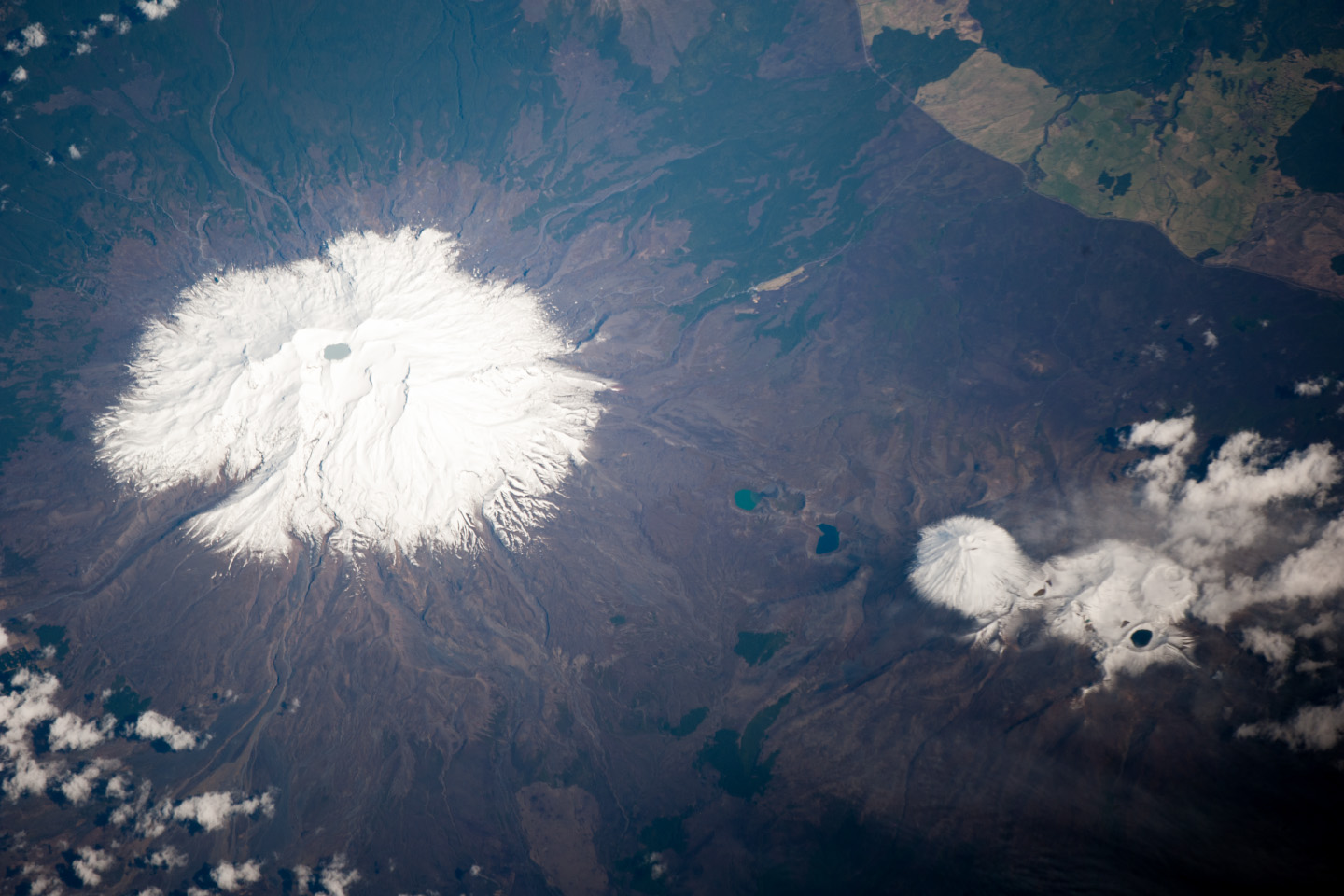 Mount Ruapehu is the largest and historically most active of several volcanic centers on the North Island of New Zealand. At 2,797 meters (9,177 feet), the volcano is the highest mountain on North Island. In this photograph taken by an astronaut on the International Space Station, Ruapehu is covered with snow on its upper slopes.