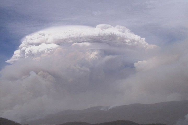 Occasionally, if the superheated air rises fast and high enough, it forms a towering thundercloud. Like the thunderstorms that form on a hot summer’s day, the tops of these cauliflower-shaped clouds reach high enough into the atmosphere that ice crystals form. Those ice crystals electrify the cloud, creating lightning. Called pyrocumulonimbus clouds, the clouds are capable of dangerous lightning, hail, and strong winds. One such firestorm in 2003 pelted Canberra, Australia, with large, soot-darkened hail, produced a damaging tornado, and generated strong winds that caused the fire to explode into neighborhoods in the capital city.