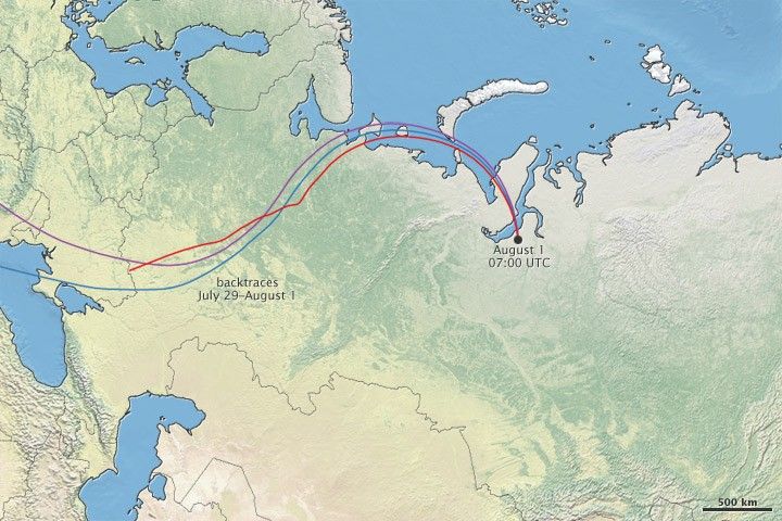 Four satellite sensors together confirmed that a pyrocumulonimbus cloud had formed and drifted over northern Russia, but where had the dangerous storm originated? By tracing the air back in time in a weather model, Fromm discovered that the air over northern Russia had traveled from western Russia. The cloud and smoke that the satellites observed had been situated over the fires in western Russia on July 30, when the fires had grown explosively. The satellites provided evidence that a firestorm helped fuel the fires’ growth.