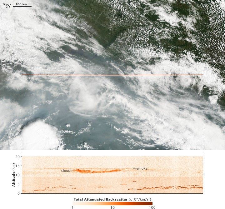 Fortunately, CALIPSO passed over part of the suspicious cloud on August 1. The sensor recorded the high, dome-shaped cloud at 12 kilometers. It also confirmed that the cloud contained more than water and ice. Smoke aerosols formed a cap over the cloud, and the air around the cloud was contaminated with smoke. The cloud, CALIPSO confirmed, was a pyrocumulonimbus.