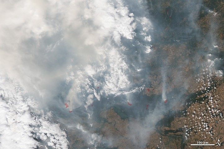 Thick, choking smoke hung over Russia on August 1, 2010, adding to the misery of a stifling summer heat wave. Thousands of people were fleeing nearly 700 fires burning in the drought-dried forests and peat bogs of western Russia, while those not directly threatened were struggling to see through and breathe the smoky air.