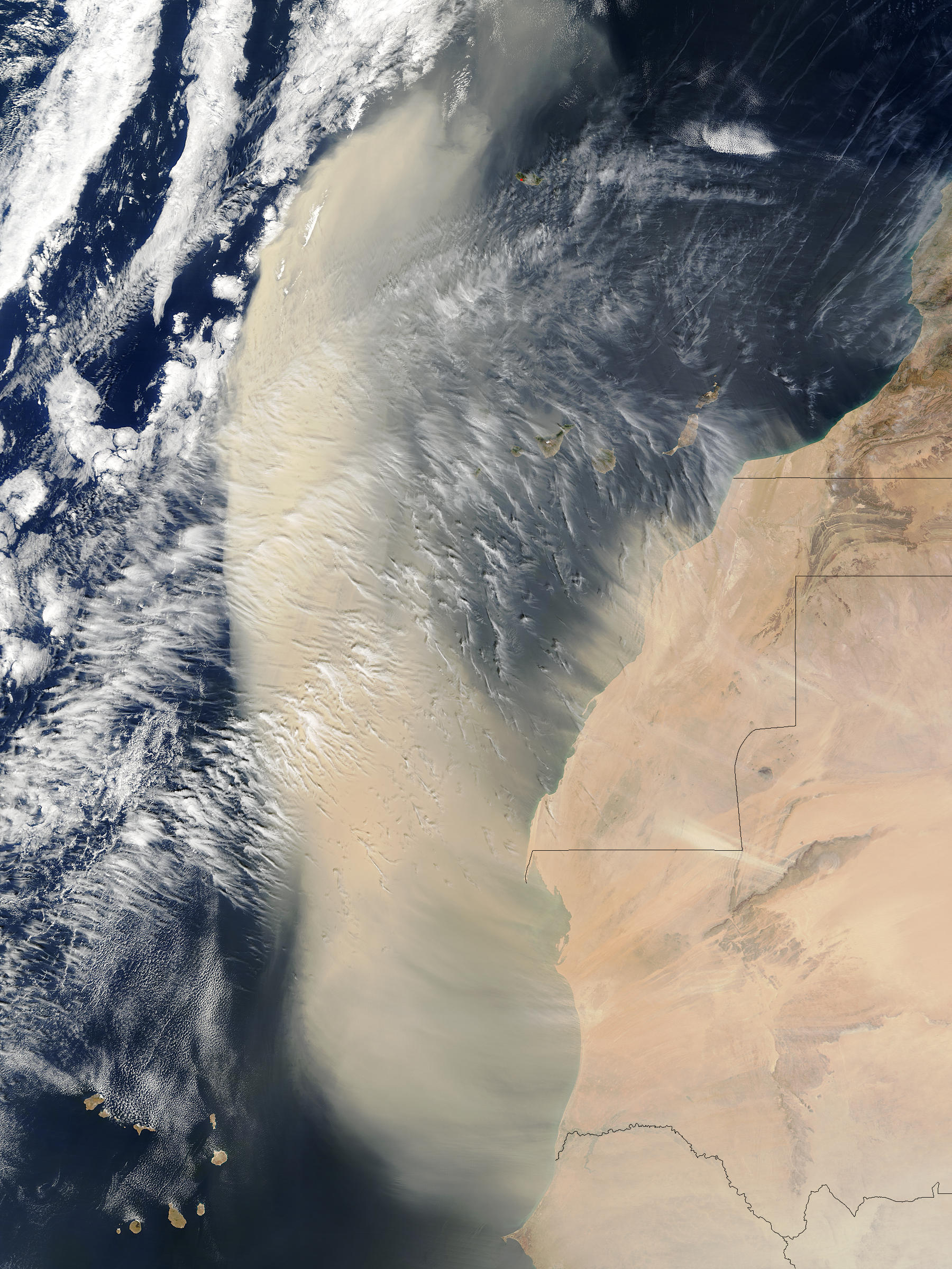A wall of Saharan dust that was captured in an image from March 3, 2004, had billowed out over the Atlantic and begun to spread northward by the next day. This image of the massive plume of dust was captured by the Moderate Resolution Imaging Spectroradiometer (MODIS) on the Terra satellite on March 4, 2004. Countries pictured are (top to bottom) Morocco, Western Sahara, Mauritania, Senegal (left), and Mali (right). At bottom left are the Cape Verde Islands, and west of Morocco are the Canary Islands, veiled by the blowing dust.