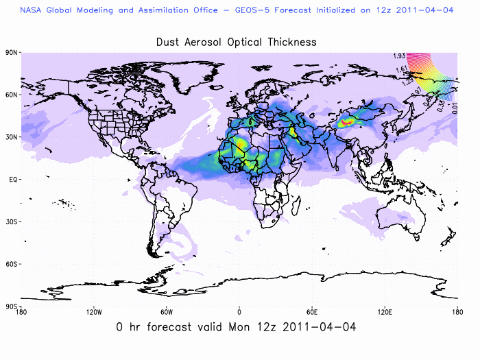 NASA image courtesy Jeff Schmaltz, MODIS Rapid Response Team at NASA GSFC. Animation from the Global Modeling and Assimilation Office GEOS-5 aerosol forecast. Caption by Holli Riebeek.