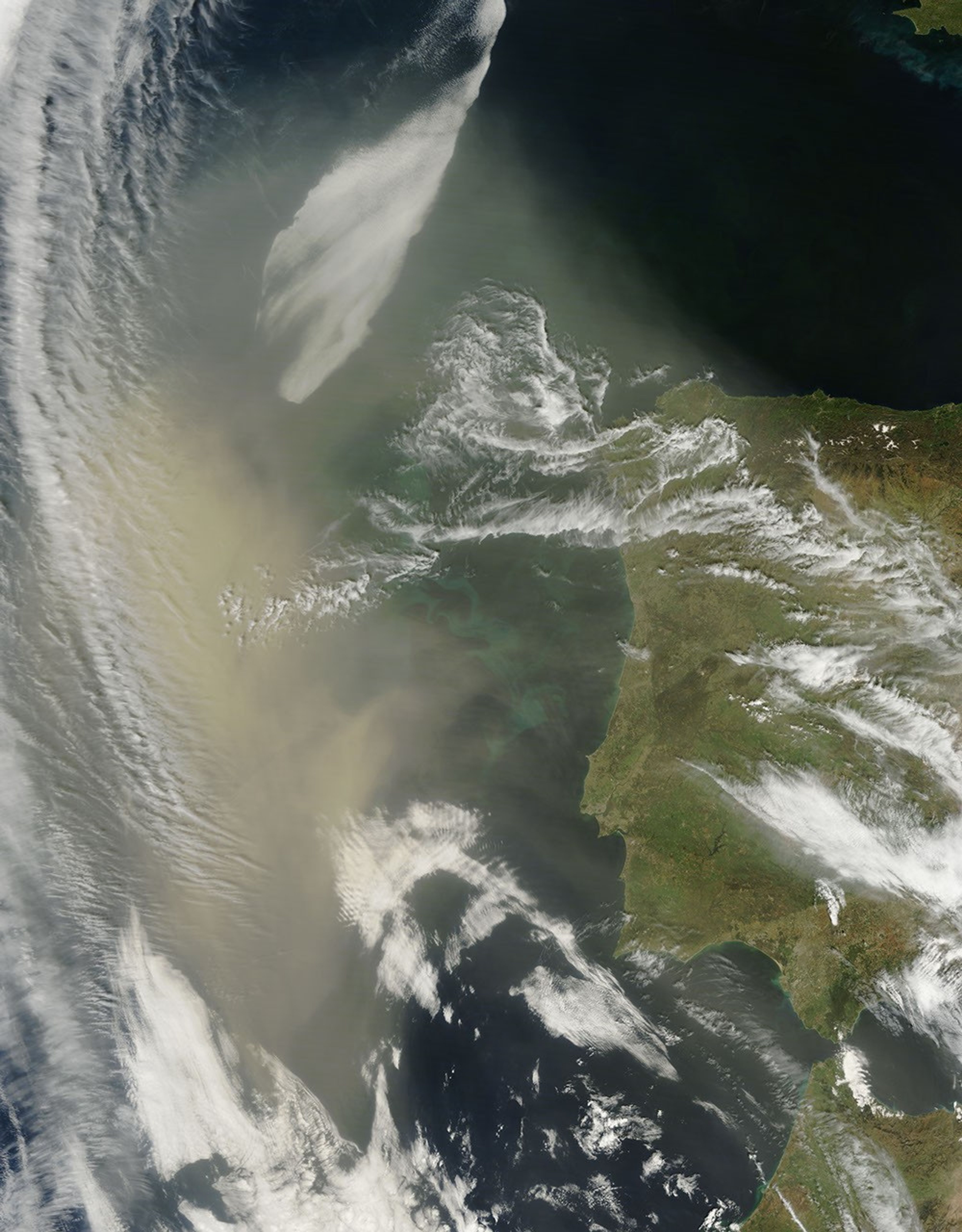 A thick plume of dust hangs over the Atlantic Ocean off the coast of Portugal in this image from the Moderate Resolution Imaging Spectroradiometer (MODIS) on NASA’s Terra satellite on April 6, 2011.