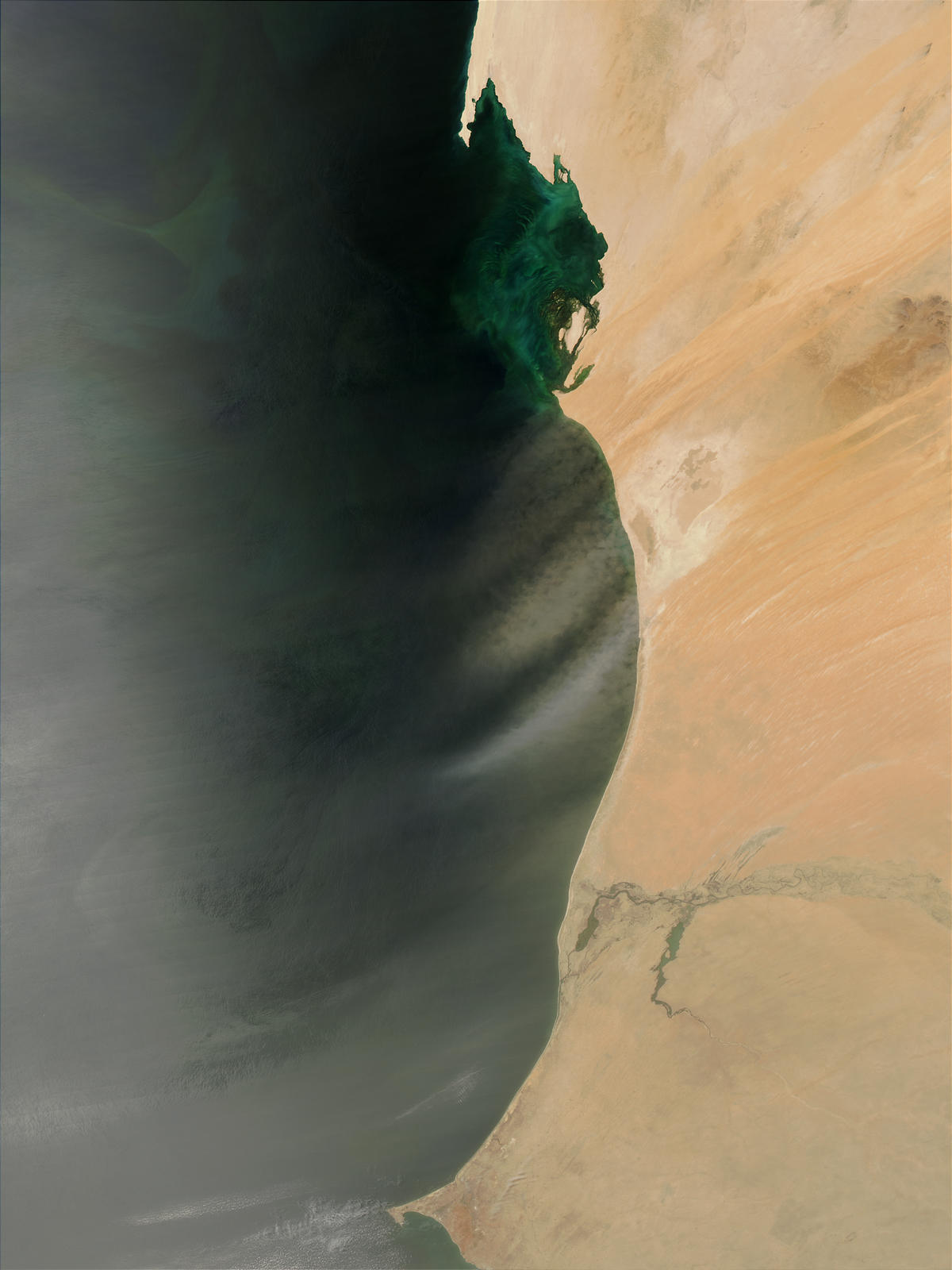 Dust storms regularly sweep out over the Atlantic Ocean from the Sahara Desert at this time of year, sometimes blowing all the way to North and South America. This Moderate Resolution Imaging Spectroradiometer (MODIS) image from the Aqua satellite on May 25, 2003, shows several plumes of dust billowing from the West African coastline. In the coastal waters, colorful blooms of marine organisms color the waters blue and green.