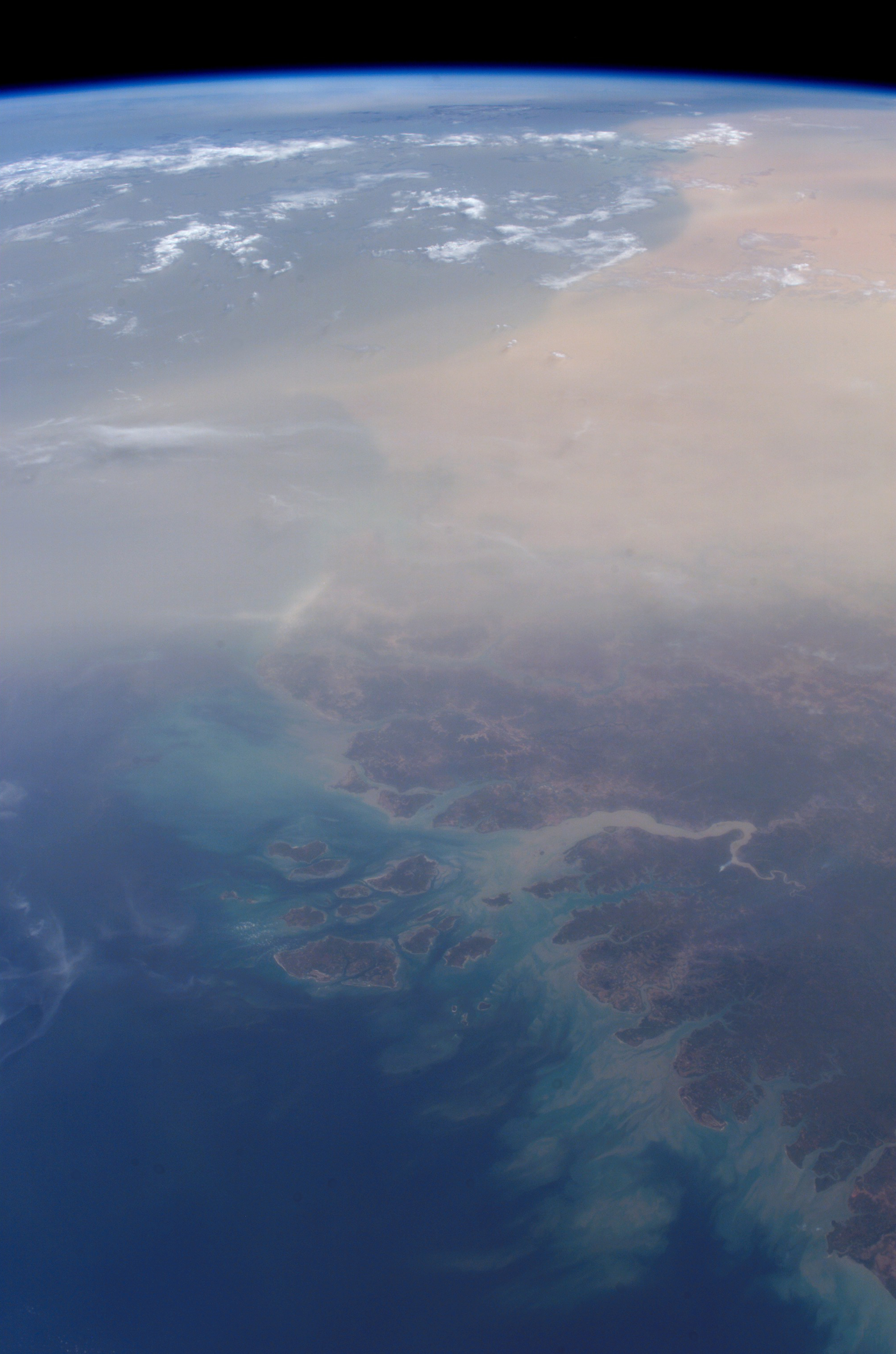 Airborne African dust regularly reaches northeastern South America and the Caribbean. Westward dust transport from the Sahara across the central Atlantic has been a common occurrence this spring, with major events visible in both satellite images and photographs. Cap Vert, the westernmost point of Senegal, is dimly visible beneath the dust mass (center); the Arquipélago dos Bijagós in Guinea Bissau lies opposite the mouth of the sediment-laden Rio Corubal.