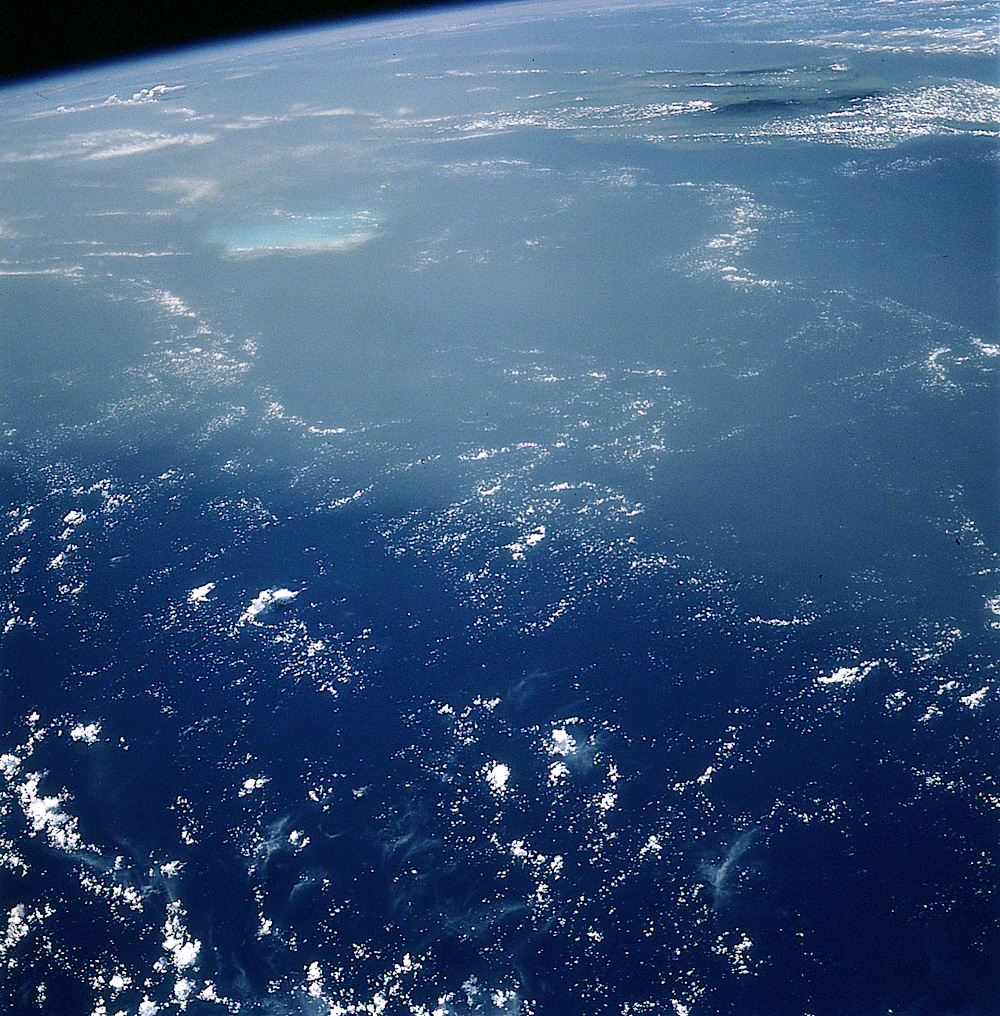 The Columbia image also shows the brilliant blues of the shallow banks surrounding the Caicos Island in the Bahamas. The mountainous spine of Haiti lies further away, partly obscured by dust. Closer to the foreground—about 26 degrees north latitude—the skies are clear.