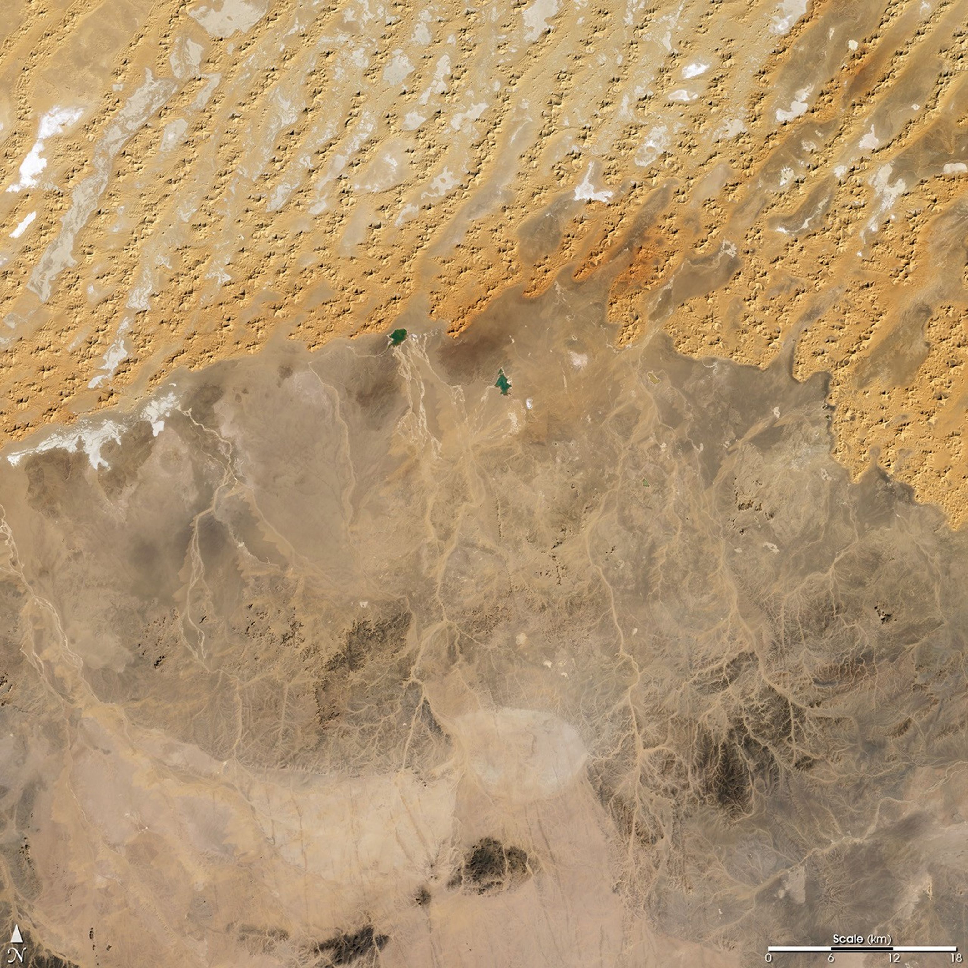 The Sahara Desert covers most of the North African country of Algeria.Rainfall is scarce, and it comes and goes rapidly, flowing through channelscalled wadis. When dry, as they are in this true-color Landsat ThematicMapper image from January 1, 1987, the wadis are revealed as pale tracingsacross the darker brown and gray shades of the desert landscape. In manycases, these wadis end in small pools which have no outlet. The water flowsin from the wadis and gradually evaporates, leaving behind salts and other minerals which appear white in this image. At the upper leftof the image, a few pools of bright blue-green water are hanging on despitethe aridity, their greenish color probably due to high salt and mineralcontent, or perhaps the growth of algae.