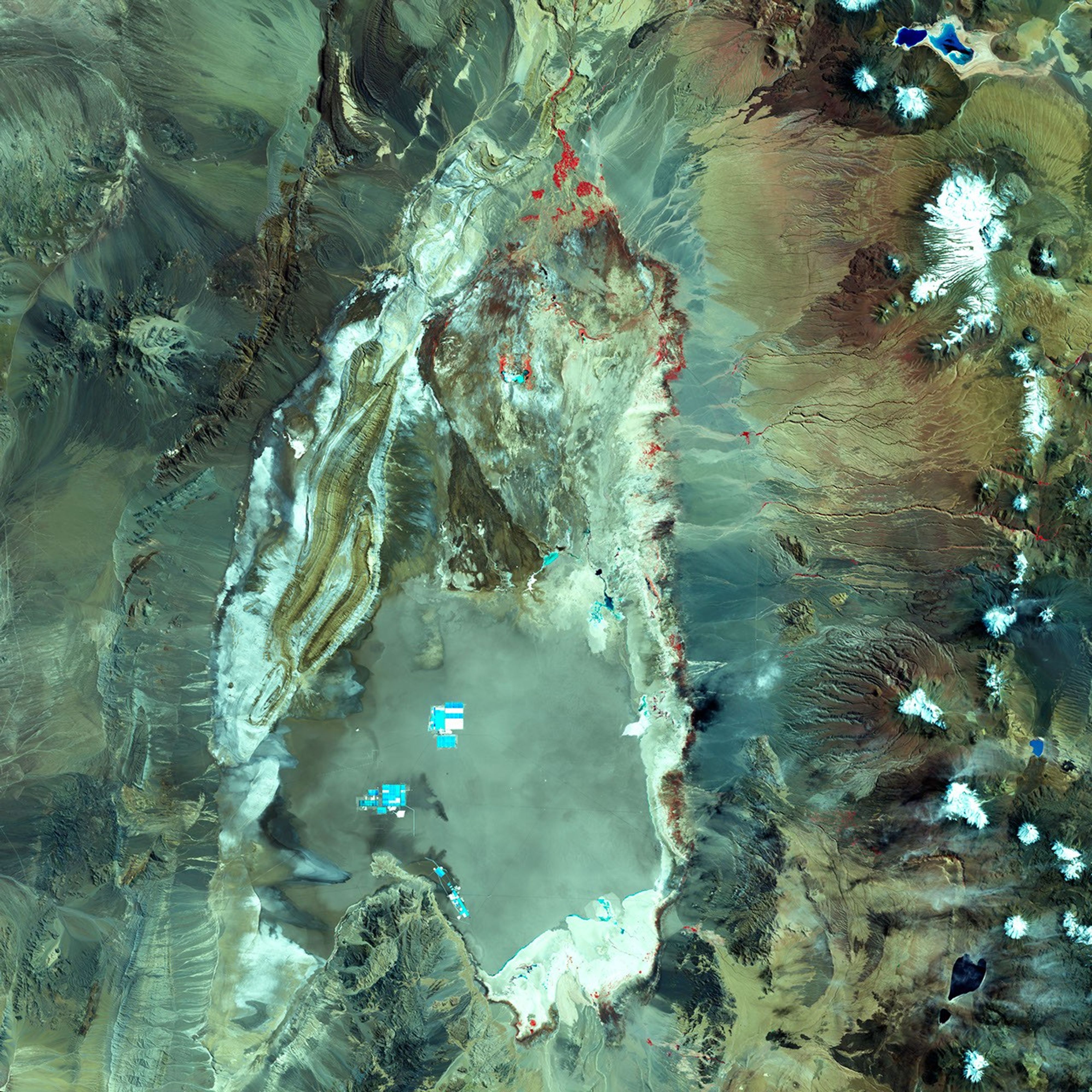 Not surprisingly, Salar de Atacama is now mined for salt, and evaporation ponds appear in the middle of the saltpan—rectangular shapes of bright turquoise and white. The salt flat also holds the potential for lithium production from its subsurface brine-bearing waters.