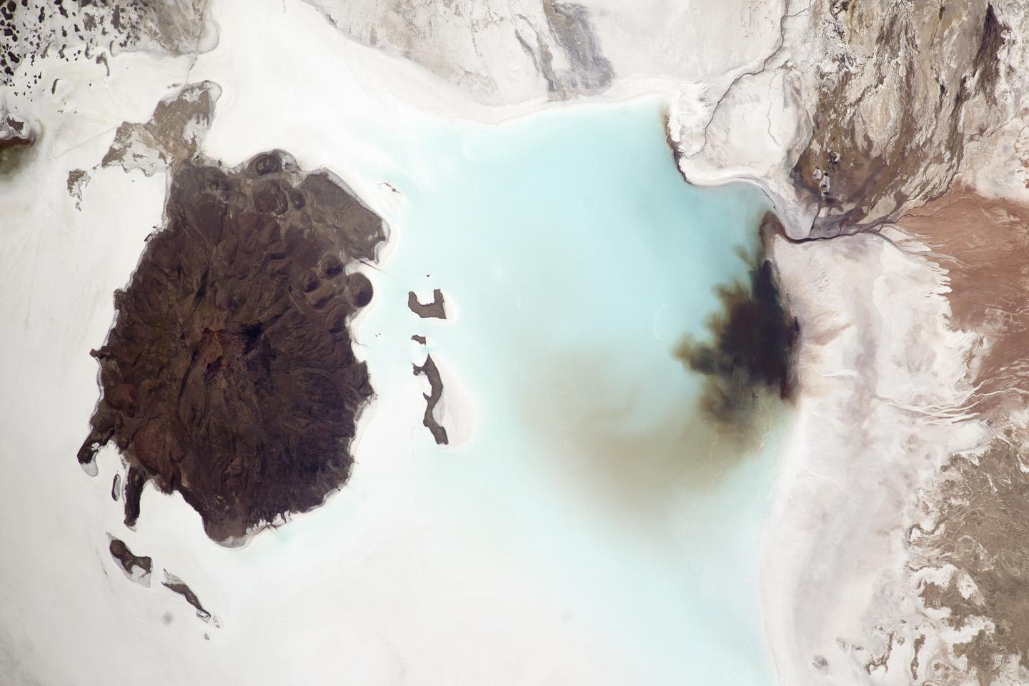 The waters of Lake Coipasa, and the white salt crust of the salar, also serve to highlight dark river sediments flowing into the basin along the northeastern shore. Dark volcanic rocks contrast sharply with the surrounding salt crust at image left. While the western Andes mountains contain many active volcanoes, the nearby Tata Sabaya volcano (not shown) has not been historically active.