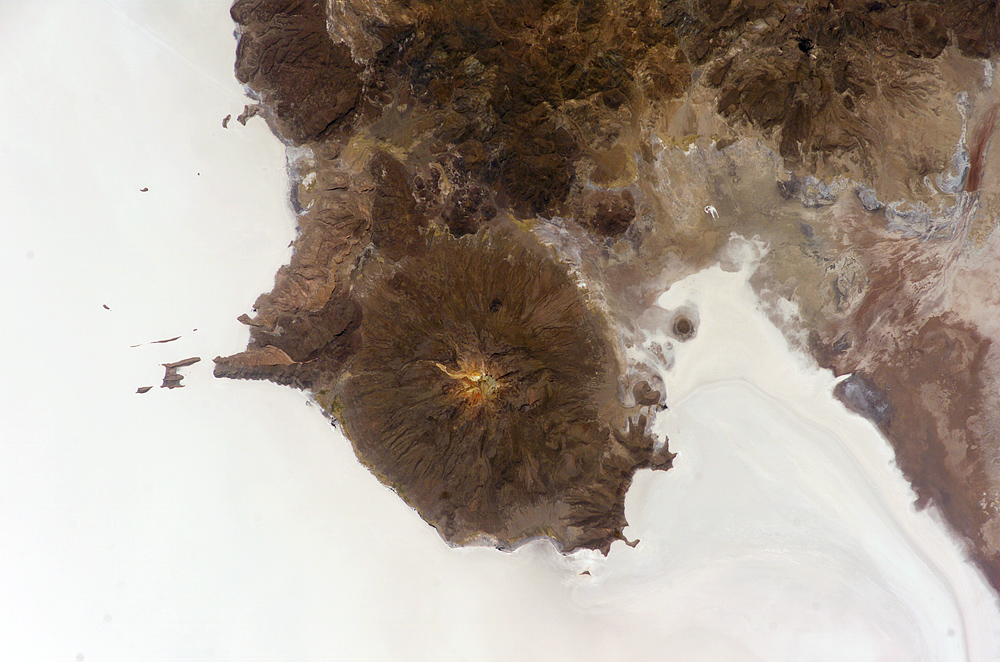 This astronaut photograph features the northern end of the salar and the dormant volcano Mount Tunupa (image center). This mountain is high enough to support a summit glacier, and enough rain falls on the windward slopes to provide water for small communities along the base. The dark volcanic rocks comprising Mt. Tunupa are in sharp contrast with the white, mineral-crusted surface of the salar. The major minerals are halite—common table salt—and gypsum—a common component of drywall.