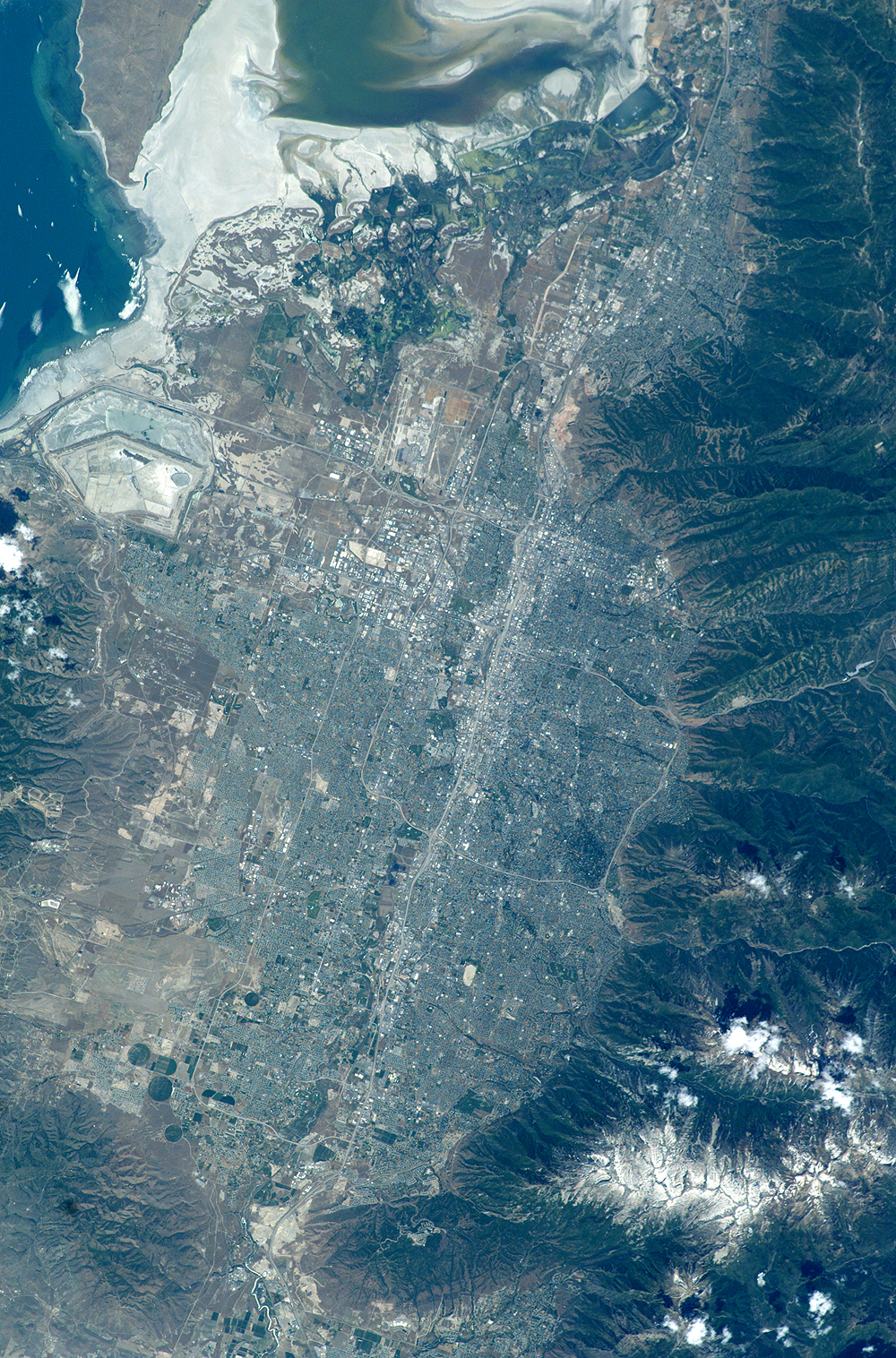This regional view of Salt Lake City, photographed on 14 June 2003 from the International Space Station, shows the city and its suburbs nestled between the Wasatch Front and the Great Salt Lake. Interstate Highway 15 runs North-South through the valley, with suburbs arrayed east and west of the highway (annotated on the image). A photograph like this one helps in visualizing the trade-offs between urban, agricultural, and wildlife uses of water in a desert environment.