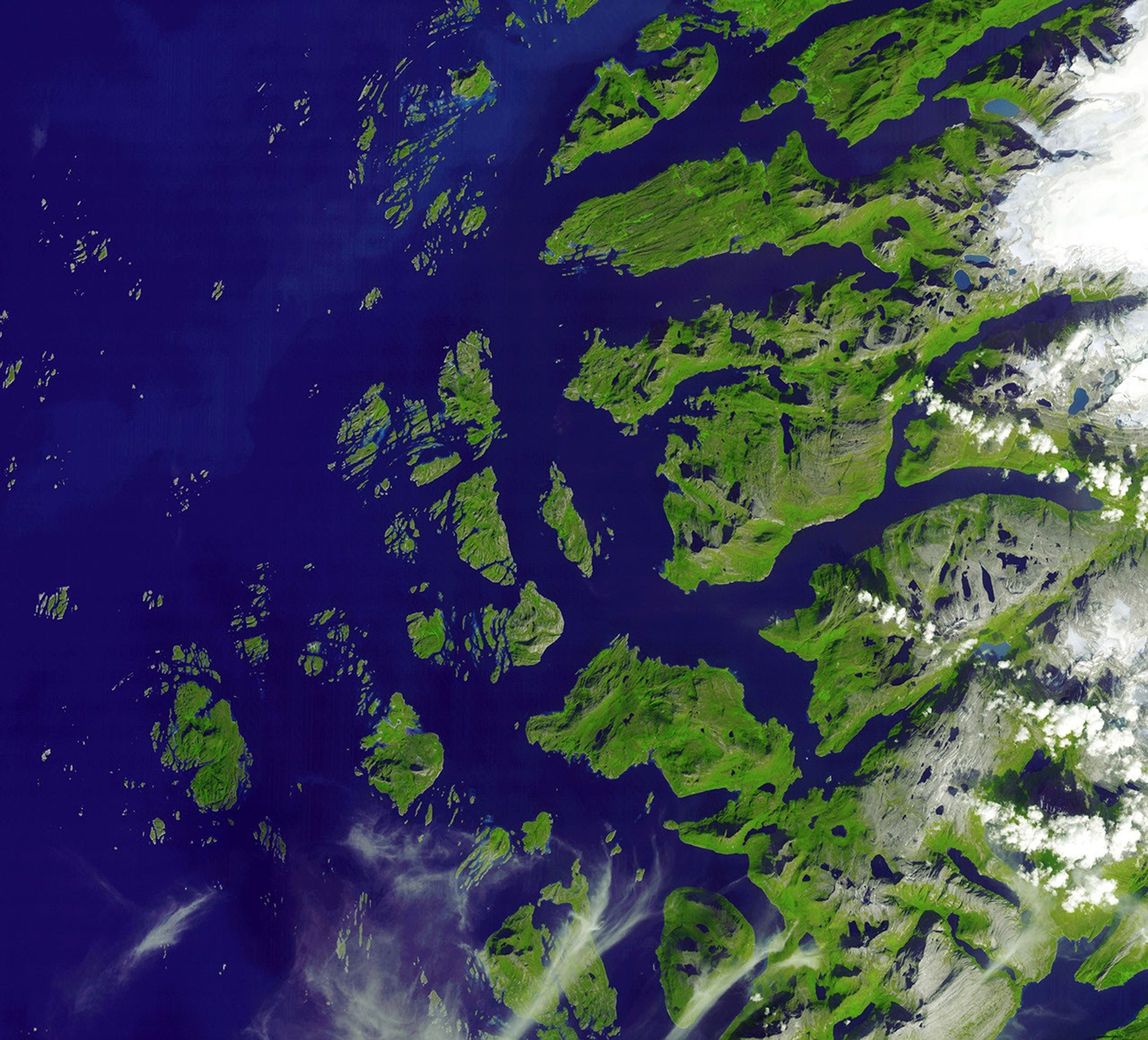 This image of the southwestern part of the park shows the diverse topography of the area. In the west, the waters of the Norwegian Sea penetrate the coastline in numerous fjords—steep-sided valleys carved by glaciers and later swallowed by the sea. Although the raked appearance of the ground on the peninsula in the northern part of the image suggests gouging by glaciers, this parallel orientation is actually a feature of the bedrock itself, which contains many aligned bands of gneiss and schist, two types of metamorphic rock.