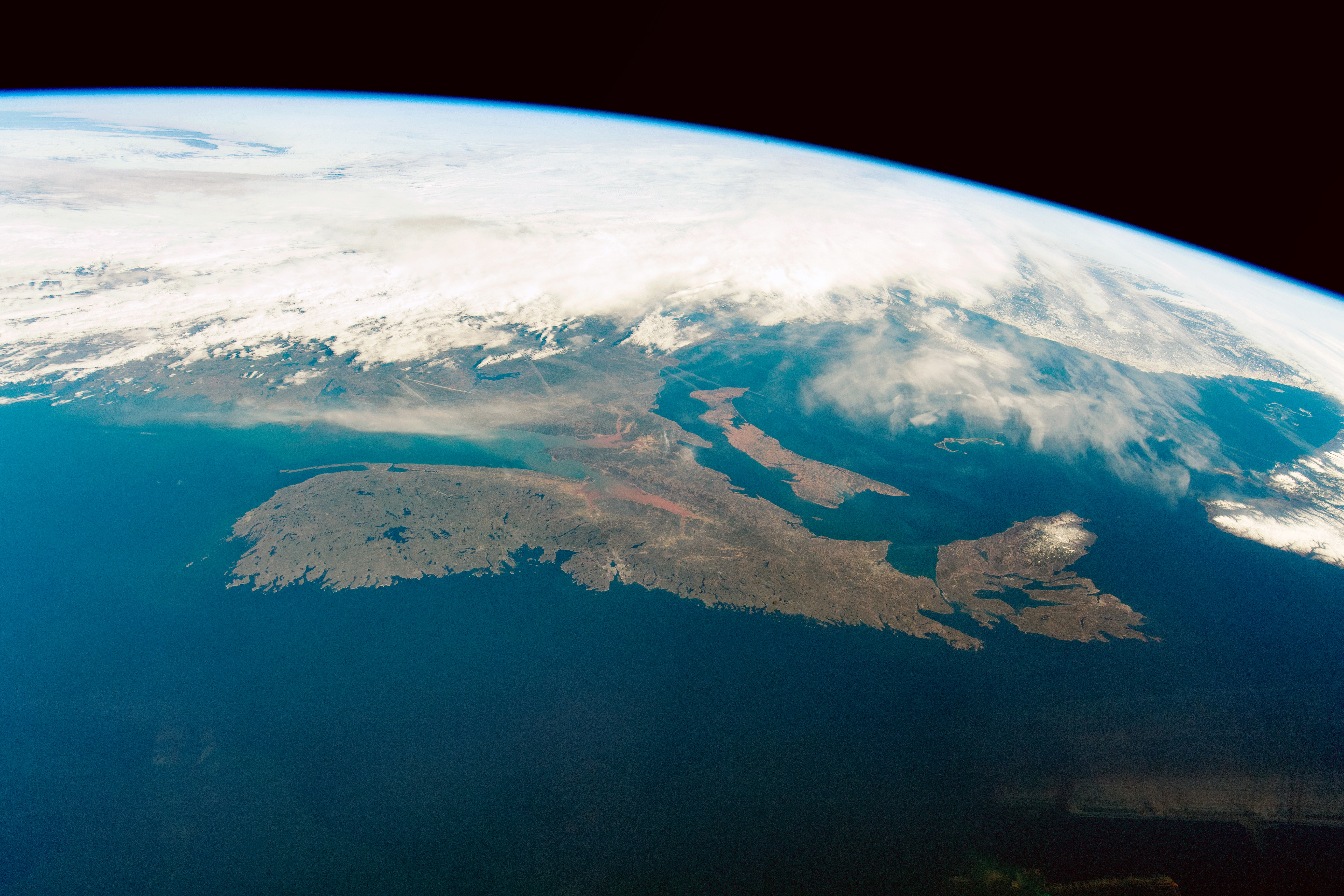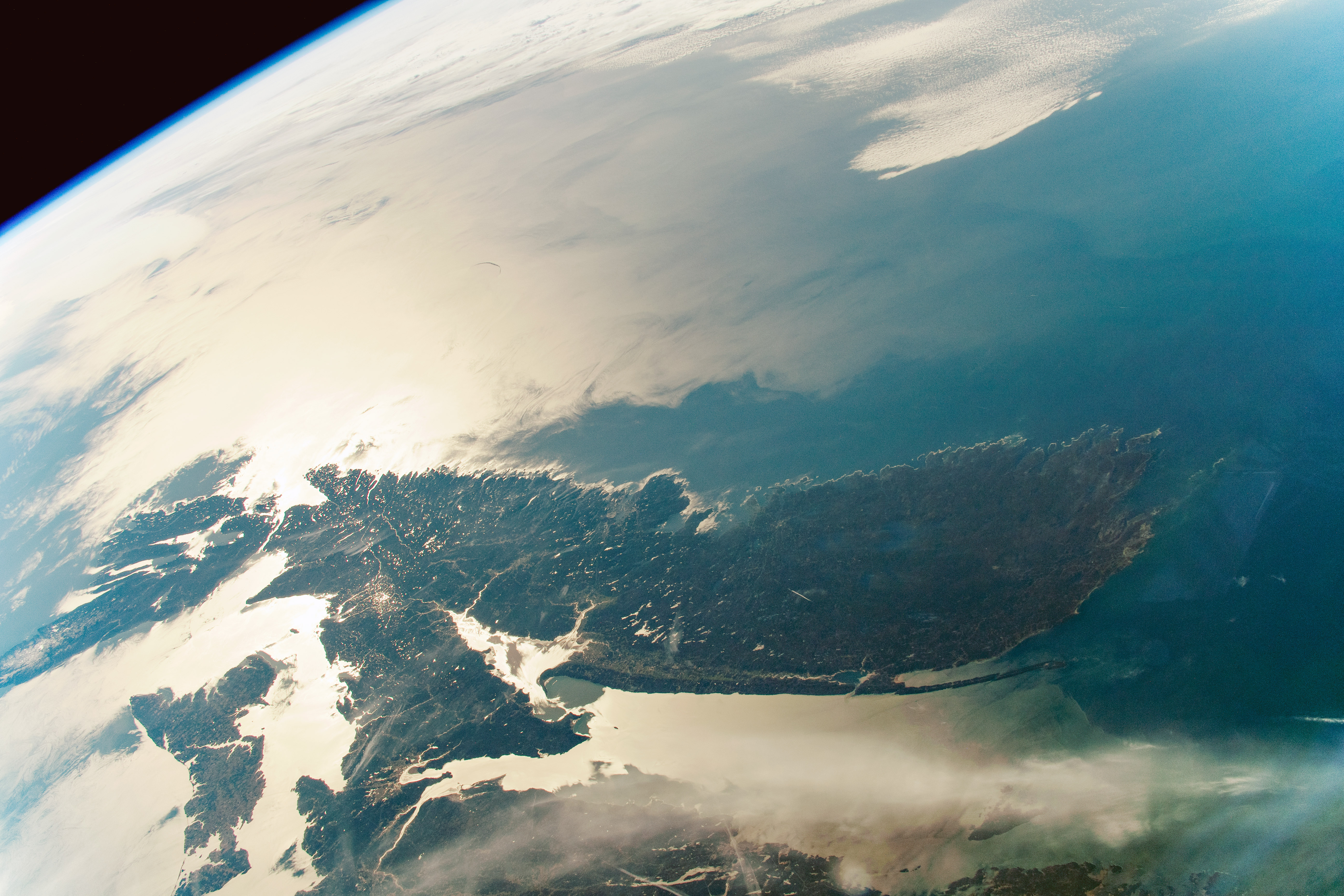 The first photograph shows Nova Scotia to the east of the space station, contrasted against the brilliance of the Sun reflecting off of the Atlantic Ocean. “Sunglint” images like this can highlight fine coastline details: Nova Scotia’s shoreline, northern arms of the Bay of Fundy, and the outline of Prince Edward Island.