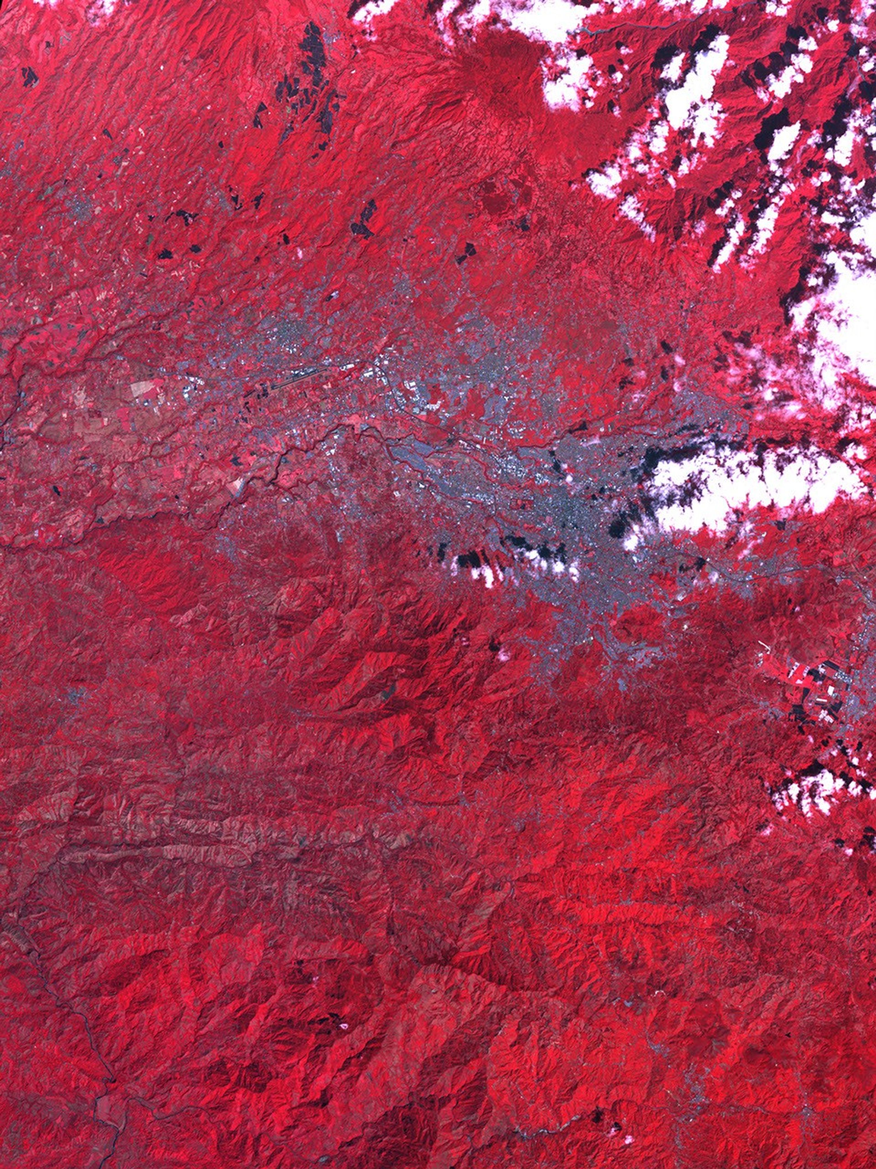 San José, capital city of Costa Rica, fills the valley between two steep mountain ranges. In this image made from data collected by the Advanced Spaceborne Thermal Emission and Reflection Radiometer (ASTER) instrument on NASA’s Terra satellite, visible, shortwave, and near-infrared wavelengths of light that the sensor observed have been combined to produce a false-color version of the scene in which vegetation is red, urban areas are silvery gray, water is dark blue, and clouds are white. The image was captured on February 8, 2007.