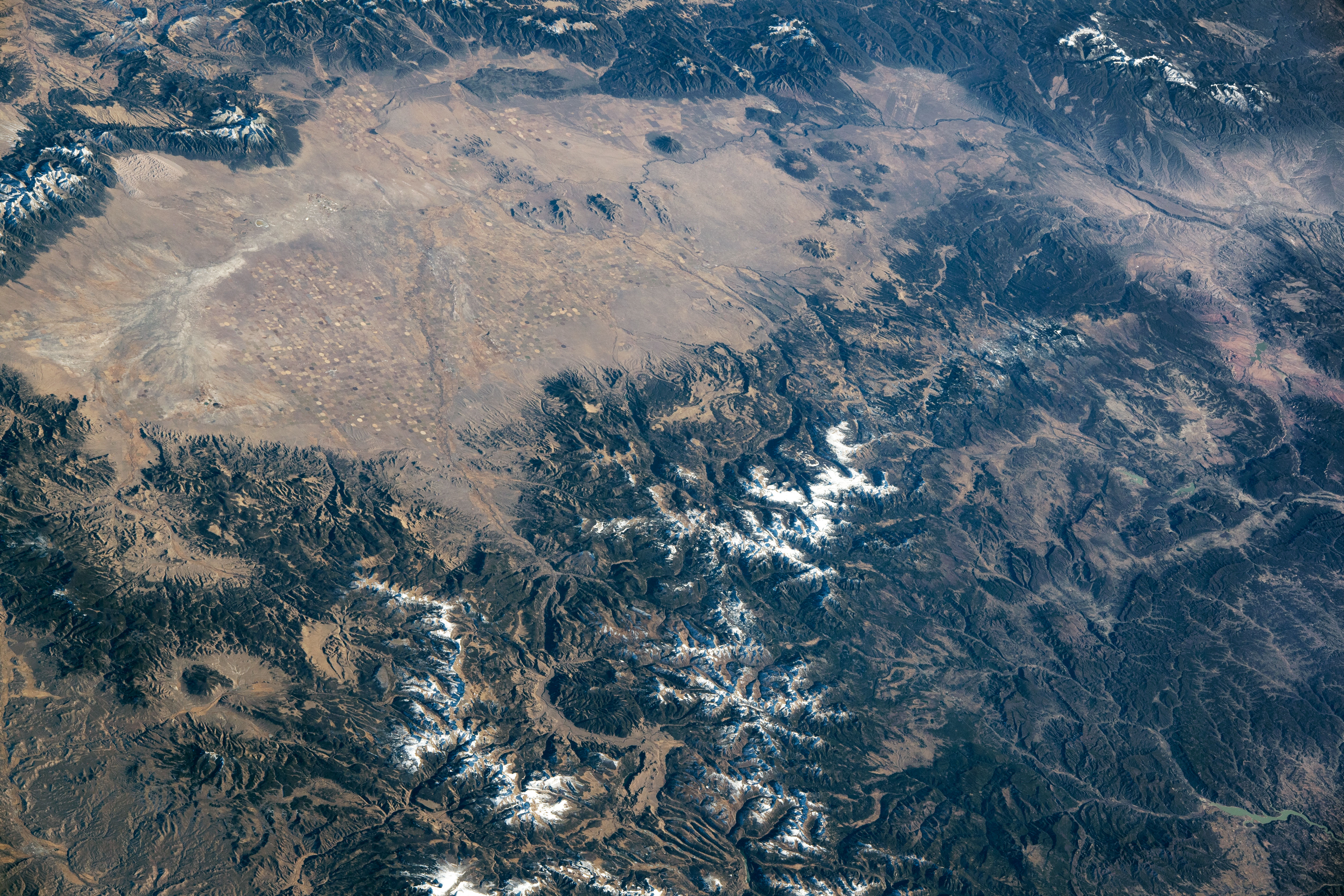 While passing over the Rocky Mountains, an astronaut onboard the International Space Station (ISS) took this oblique photograph of the San Luis Valley along the border of Colorado and New Mexico. The light-colored dunes of Great Sand Dunes National Park stand at the base of the Sangre de Christo Mountains.