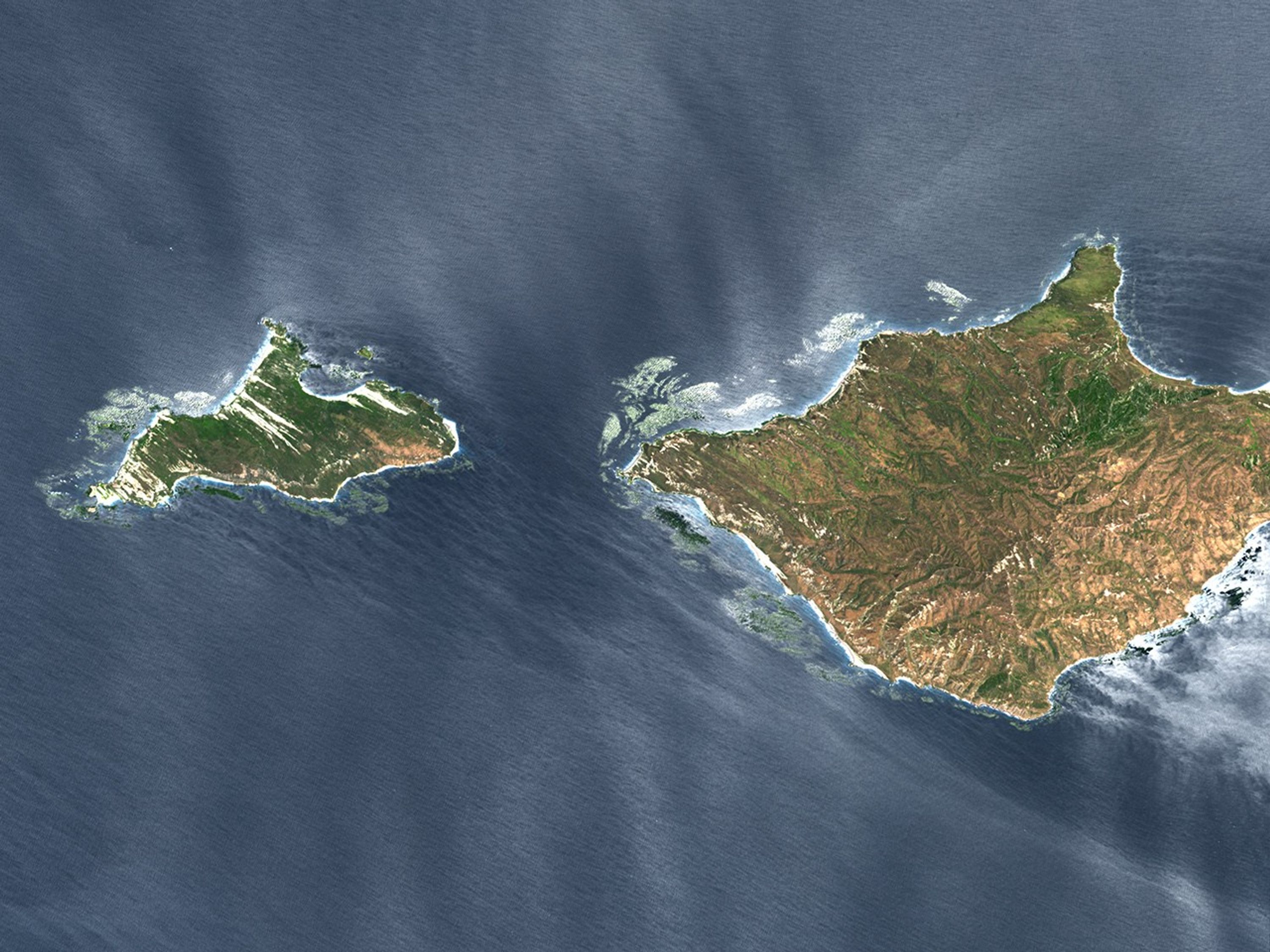 Off the California coast lies a series of small islands, all part of the Channel Islands National Park. On May 29, 2005, the Advanced Spaceborne Thermal Emission and Reflection Radiometer (ASTER) on NASA’s Terra satellite captured this image of two of those islands: San Miguel and Santa Rosa.