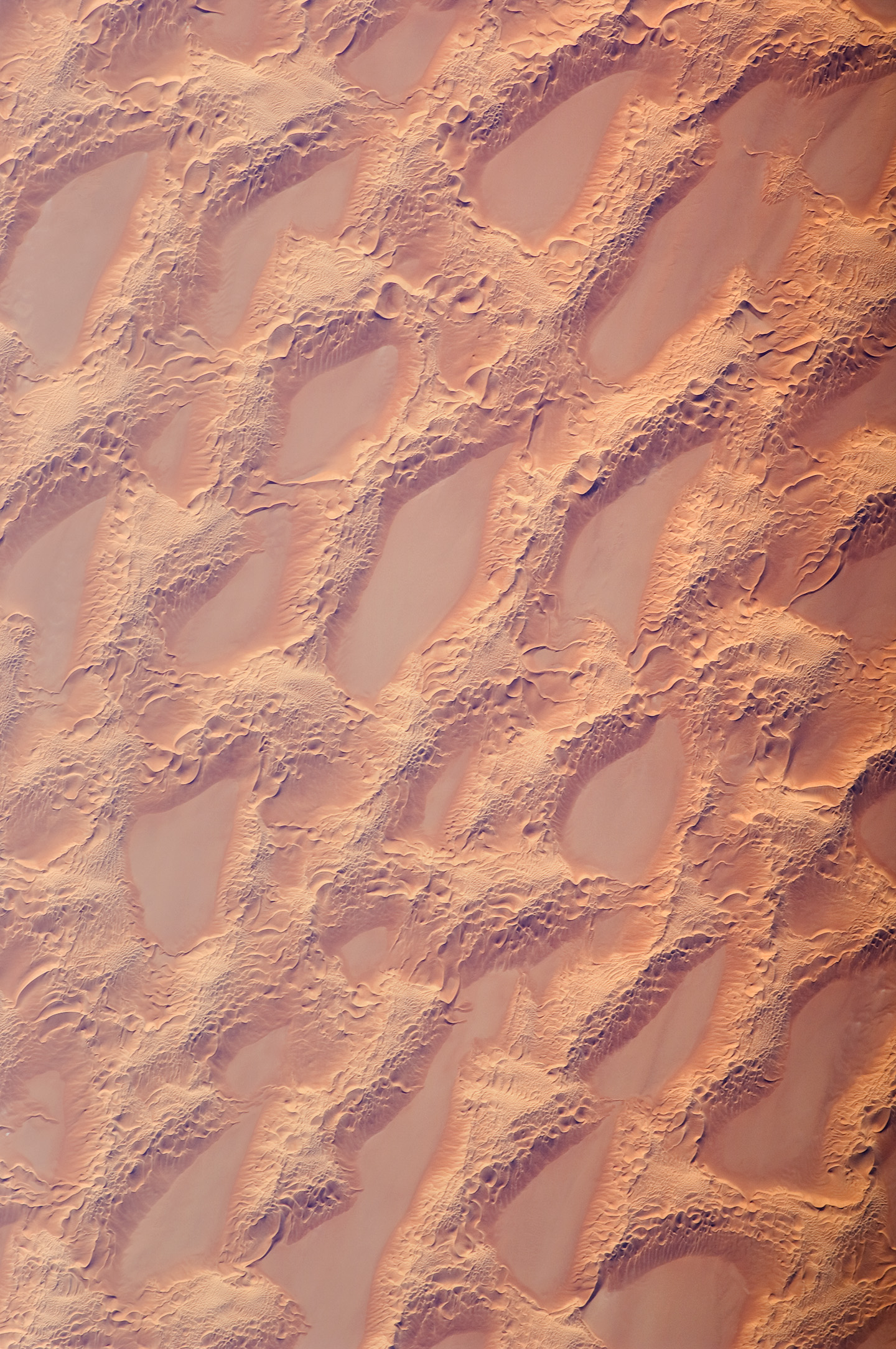 This detailed astronaut photograph, taken from low earth orbit, shows classic large and small sand masses of the central Sahara Desert, where wind is a more powerful land-shaping agent than water. “Draa” dunes (from the Arabic for “arm”) are very large masses of sand, and they appear here as the broad network of yellow-orange sand masses, with smooth-floored, almost sand-free basins between them. These sand masses lie in the western part of Libya’s vast Marzuq Sand Sea (centered at 24.5 degrees north, 12 degrees east). Geologists think that the draa of the Marzuq were probably formed by winds different from the prevailing north-northeast winds of today.