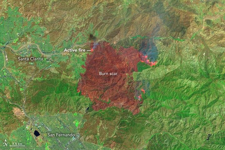 In the top, natural-color image, the land surface is slightly darkened in the hills and canyons north and east of Santa Clarita and San Fernando. The primary evidence of the fire is the smoke plumes around the edges. The second, false-color image provides a clearer view of the burn scar. It combines shortwave infrared, near-infrared, and green light (Landsat OLI bands 7-5-3) to show active fires (bright red), scarred land that has been consumed by the fire (darker red), and intact vegetation and human development (green).