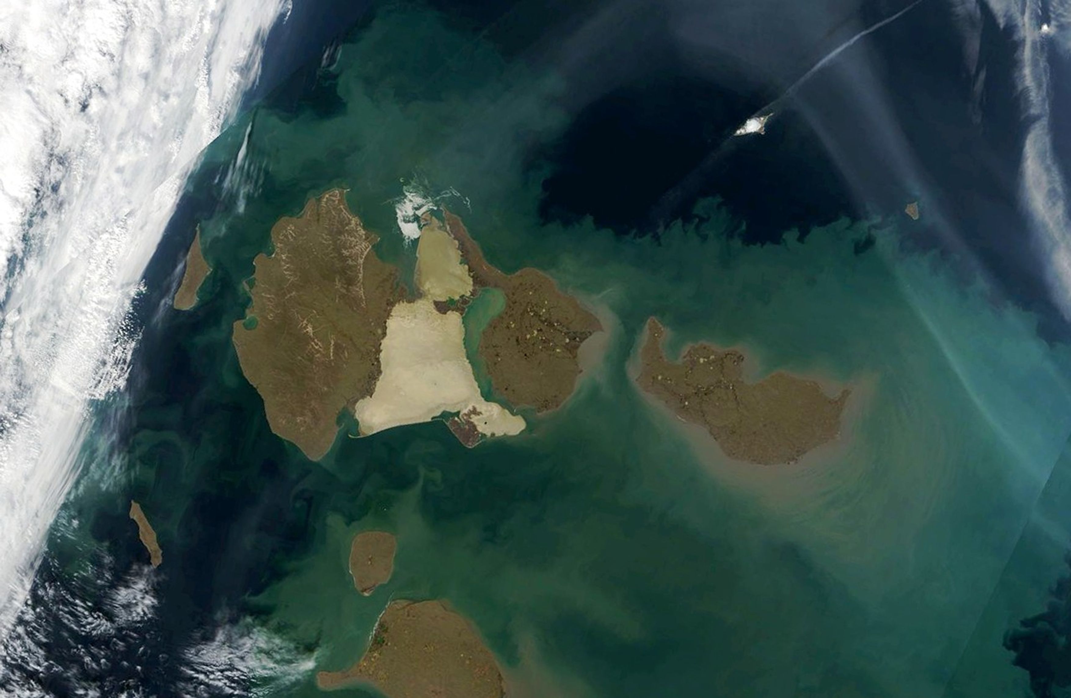 The image above shows the central region of Bunge Land on September 11, 2020, as observed by the Operational Land Imager (OLI) on Landsat 8. The image below shows a wider view with the sandy plain sandwiched between two neighboring islands. This image was acquired on August 12, 2012, by the Moderate Resolution Imaging Spectroradiometer (MODIS) on NASA’s Terra satellite.