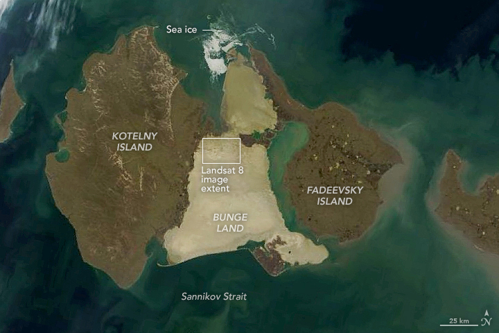 Bunge Land belongs to the Anzhu Islands in the New Siberian Islands archipelago. The 7,000 square kilometer (3,000 square mile) plain is actually a land bridge connecting Kotelny Island and Fadeevsky Island. Some researchers theorize that movements of Earth’s crust caused a patch of seafloor to rise above the water line.