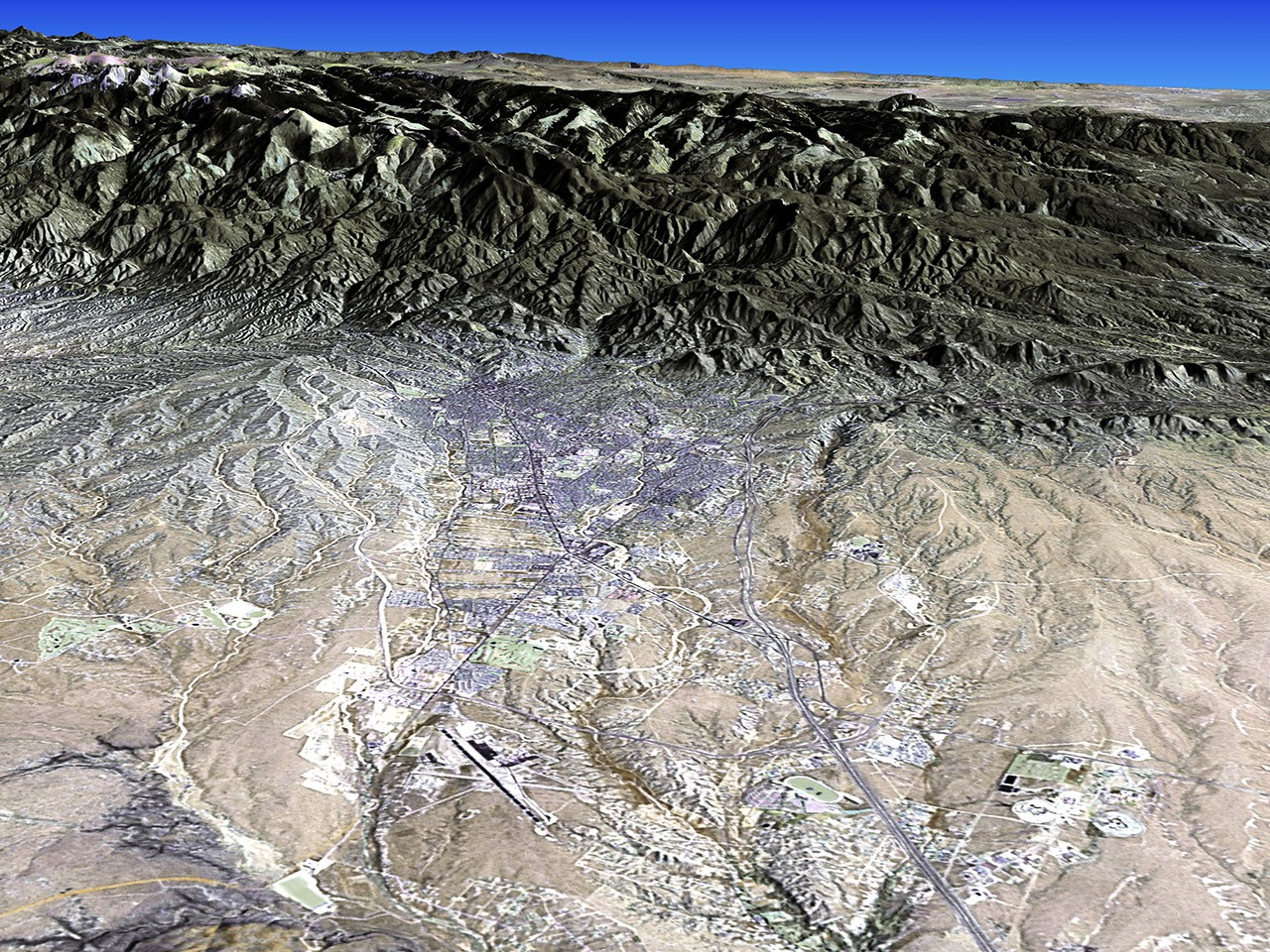 This visualization shows the city as seen by the Landsat 7 satellite’s Enhanced Thematic Mapper Plus (ETM+) instrument. Data shown here use shortwave-infrared, near-infrared, and green wavelengths (ETM+ bands 7, 4, and 2), which have been pan sharpened to enhance the resolution and color balanced to simulate a natural-color appearance. The data were obtained from a collection of cloud-free scenes over all of North America collected by Landsat 7 in 2000 and stitched together by EarthSat Corporation for NASA. The subsection of the mosaic around Santa Fe was draped over a digital terrain model with realistic terrain (i.e., the differences in elevation among land surface features has not been exaggerated).