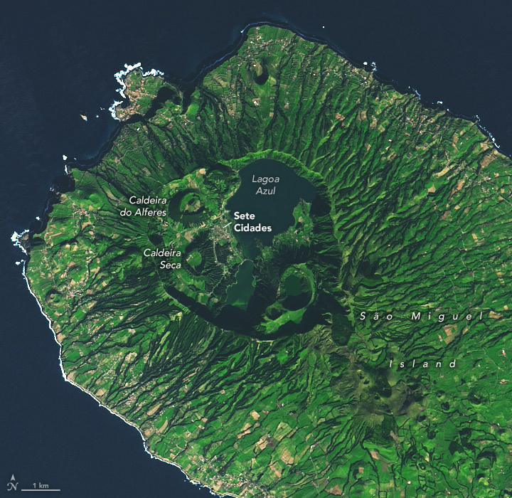 In this detailed view, a series of smaller volcanic cones and two lakes are visible inside the caldera of Sete Cidades. The summit caldera, about 5 kilometers (3 miles) wide and 400 meters (1,300 feet) deep, formed when the summit collapsed about 22,000 years ago. Two other volcanic cones also appear in the image: Caldeira do Alfreres, which formed during an eruption around 2050 BCE, and Caldeira Seca, which last erupted in 1444.