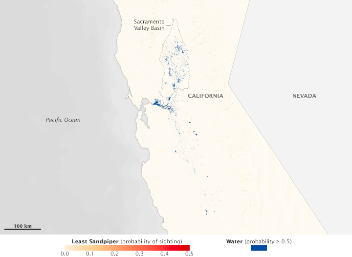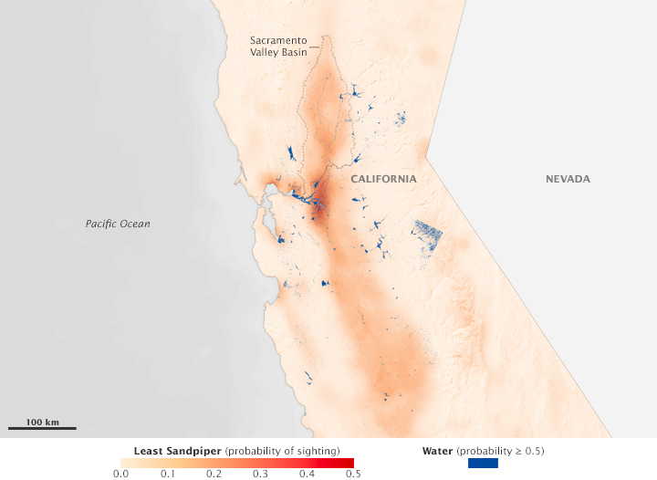 For several years, the Cornell Lab of Ornithology has organized the eBird program, which collects on-the-ground observations (including species and date spotted) from bird watchers nationwide. With a recent NASA grant to Cornell, scientists created computer models to analyze that eBird data and combine it with remote sensing imagery from Landsat and the Moderate Resolution Imaging Spectroradiometer (MODIS) instruments on NASA’s Terra and Aqua satellites. With these models, they could identify areas in the Central Valley where birds flocked during the spring and fall migrations, and they could estimate the number of birds making the journey.