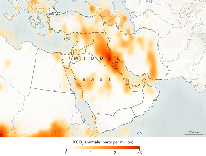 “OCO-2 can even detect smaller, isolated emitting areas like individual cities. It’s a very powerful tool that gives new insight,” said Hakkarainen, the atmospheric scientist at FMI who led the study. “One of the most interesting findings was to see a strong signal over Middle East that is not present in emission inventories—suggesting that the inventories might be incomplete over that area.” (Note that the Middle East map does not show data east of Iran because calculations have not yet been made for those areas.)