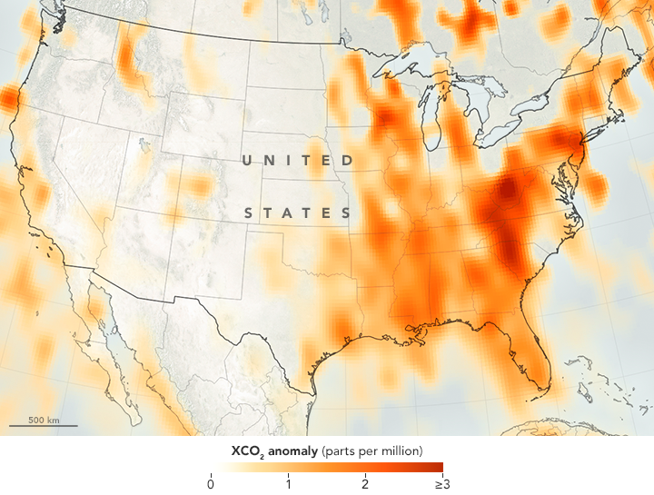 Carbon dioxide molecules linger in the atmosphere for a century or more, so much of what OCO-2 observes is greenhouse gas that was emitted and accumulated years ago. The amount also fluctuates with the seasons, as plants and phytoplankton soak up more carbon during spring and summer and less in the winter.