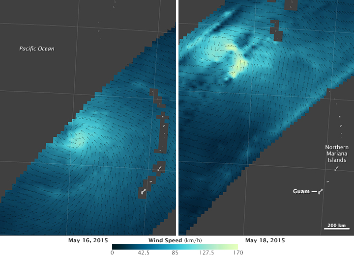 In this case, RapidScat acquired data on two dates. On May 16, the strongest winds of Typhoon Dolphin were south and east of the center of circulation, with sustained wind speeds near 120 kilometers (70 miles) per hour. By May 18, maximum sustained winds were 170 kilometers (110 miles) per hour in the northern and eastern quadrants of the storm.