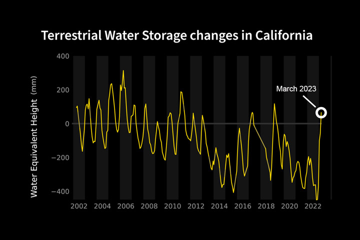 After years of intense drought and diminishing groundwater, California just saw its greatest year-over-year water gains in two decades, according to data from the Gravity Recovery and Climate Experiment Follow-On (GRACE-FO) satellite mission, a partnership between NASA and the German Research Centre for Geosciences (GFZ). This past winter’s bonanza of atmospheric rivers alleviated some of the water deficit that the state incurred during periods of drought over the last 10 years, which included the three driest years on record in California.
