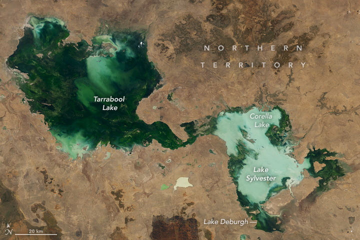 Early in the 2024–2025 wet season, the lakes covered more area than at similar times in the past two years. The OLI (Operational Land Imager) on the Landsat 8 satellite captured this image showing their extent on October 30, 2024. Lake Sylvester had merged with nearby Corella Lake and Lake Deburgh. Likewise, the water in Tarrabool Lake had connected with an area known as Eva Downs Swamp to the northwest to form a single freshwater wetland. Both systems are considered important areas for waterbirds. Together, when fully flooded, the wetlands span approximately 4,750 square kilometers (1,830 square miles), nearly the size of the state of Delaware.
