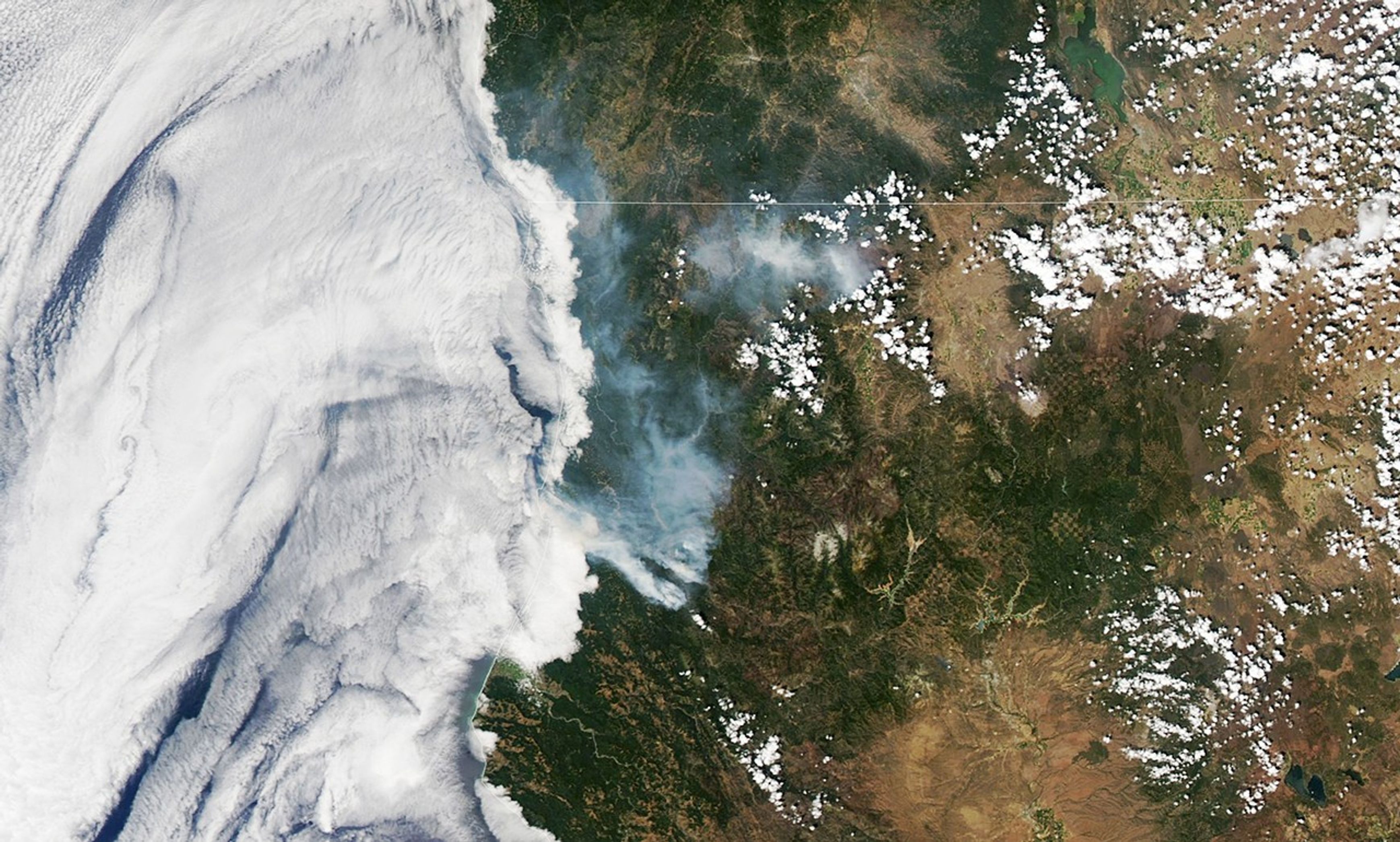 More smoke streamed from newer fires to the southwest of McKinney, visible in this wide view acquired on August 6, 2022, by the Moderate Resolution Imaging Spectroradiometer (MODIS) on NASA’s Aqua satellite. Note that the white patches close to the coast are marine stratus clouds.