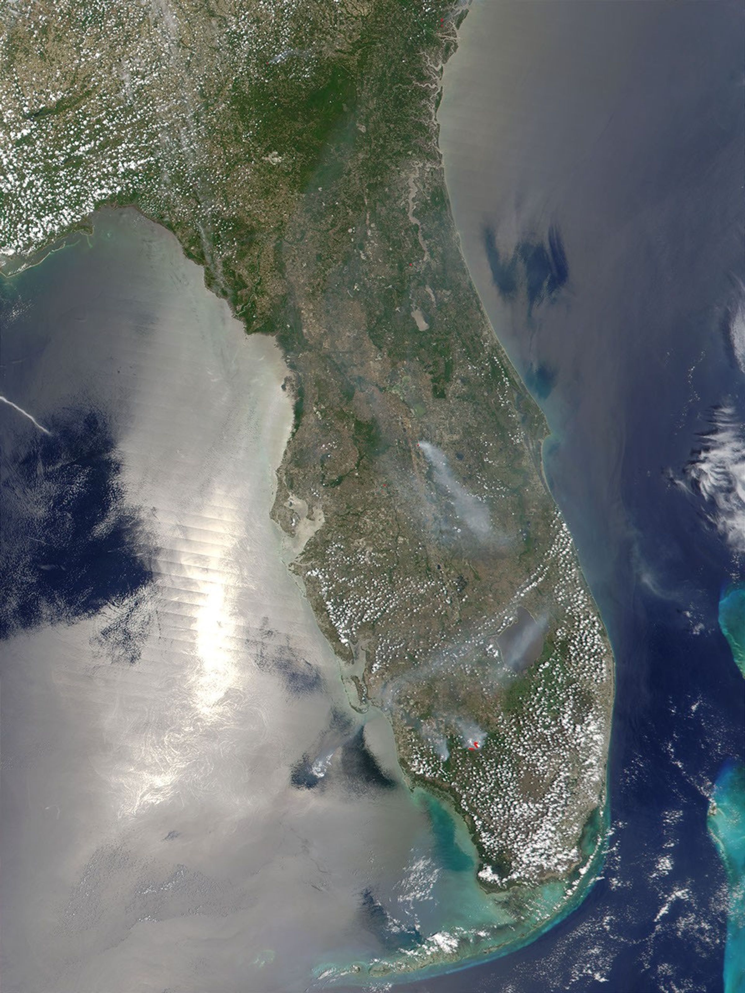 The Moderate-resolution Imaging Spectroradiometer (MODIS) acquired this true-color image of Florida on May 19, revealing a lot of smoke and haze blanketing most of the state. The red pixels show the locations of some of the larger fires and their resulting smoke plumes. (The brightness in the water west of Florida is due to sun glint.) The largest of the current fires is burning in Big Cypress National Preserve, located about 120 km (75 miles) west of Miami. That fire has already consumed roughly 15,000 acres and was only partially contained by firefighters at the time this image was taken.
