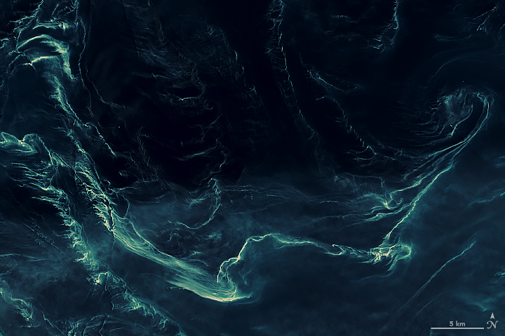 To identify potential slicks, Hu and colleagues inspected medium-resolution satellite images from sensors such as the Moderate Resolution Imaging Spectroradiometer on NASA’s Terra and Aqua satellites. When his team analyzed other satellite data for the spectral signature of the mystery Baltic Sea substance, they realized it was distinct from sea snot and other floating matter. The spectral shape had a characteristically sharp increase between wavelengths of 400 and 500 nanometers.