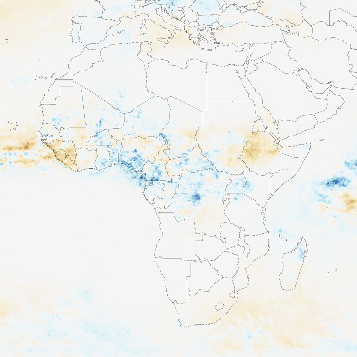 This image illustrates how extensive the extreme rainfall was. The image was made with data collected by the Tropical Rainfall Measuring Mission (TRMM) satellite between August 20 and September 21, 2007. The average daily totals recorded during this period are compared with average rainfall totals recorded during the same period since TRMM’s launch in 1997. Regions that received more rain per day than average are in shades of blue, while places that received less rain are pale to dark brown. Most of the southern Sahel received more rain per day than average in August and September. Some places received as much as 15 millimeters more rain than average per day. The northern Sahel, by contrast, was slightly drier than average.