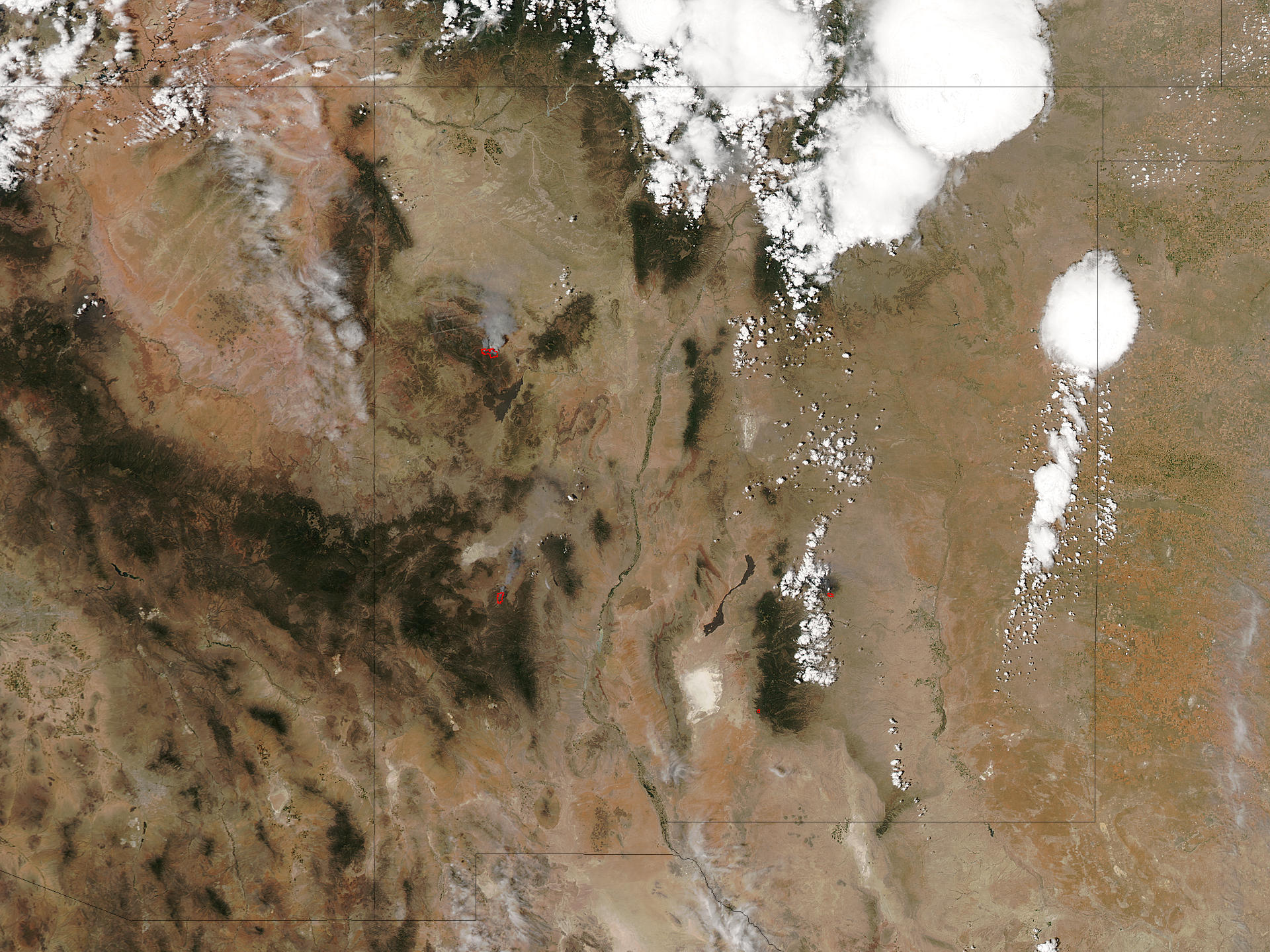 On June 15, 2004, the Moderate Resolution Imaging Spectroradiometer (MODIS) on NASAâs Aqua satellite captured this image of New Mexico, showing the Sedgwick Fire (top) in the Cibola National Forest, as well as a smaller, unnamed fire to the south (bottom). Pixels in which MODIS detected fire are outlined in red.