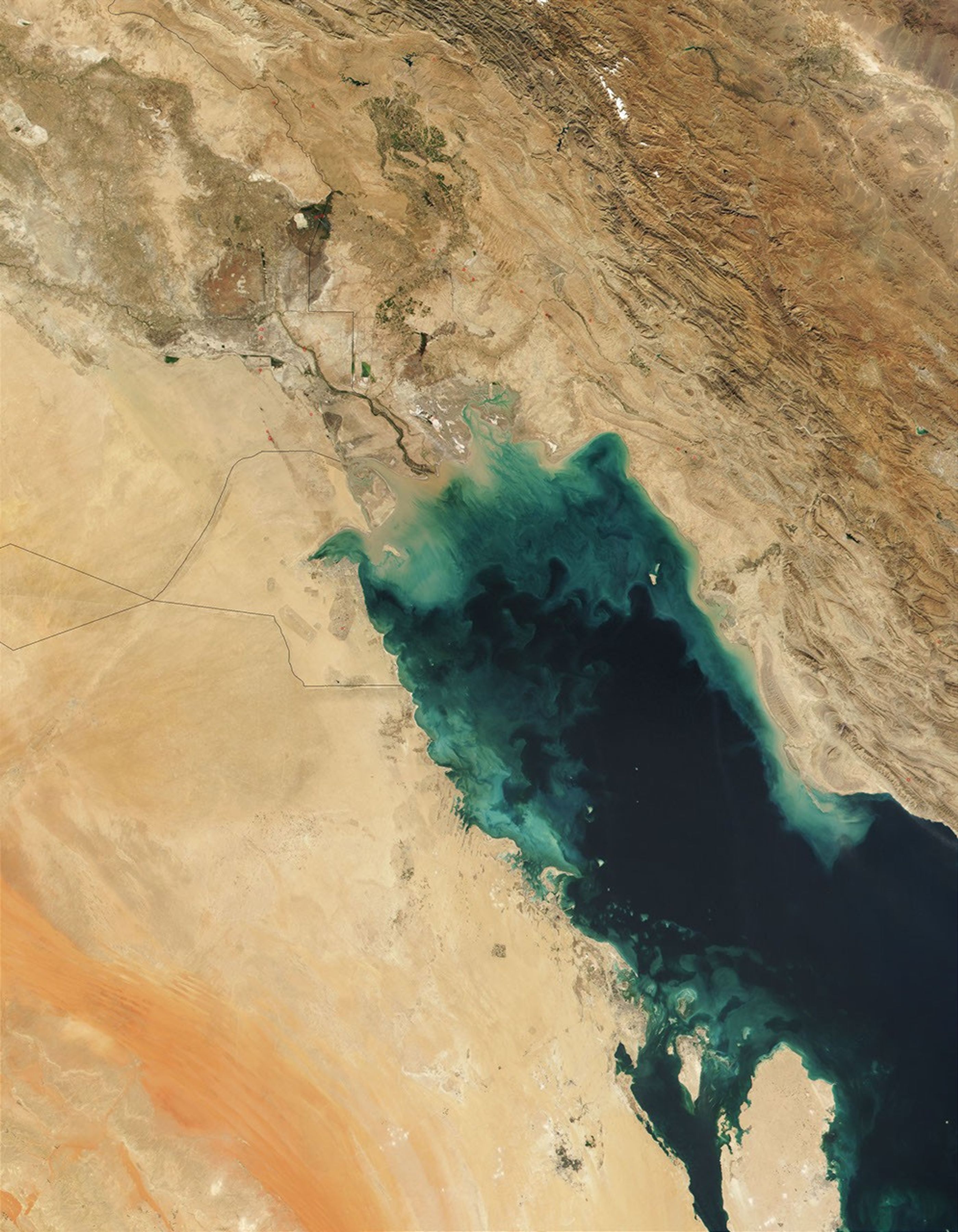 There is a large amount of sediment clearly visible in the true-colorimage of the Persian Gulf, acquired on November 1, 2001, by theModerate-resolution Imaging Spectroradiometer (MODIS). Carried by theconfluence of the Tigris and Euphrates Rivers (at center), thesediment-laden waters appear light brown where they enter the northernend of the Persian Gulf and then gradually dissipate into turquoiseswirls as they drift southward. The nutrients these sediments carry arehelping to support a phytoplankton bloom in the region, which adds somedarker green hues in the rich kaleidoscope of colors on the surface (seethe high resolution image).