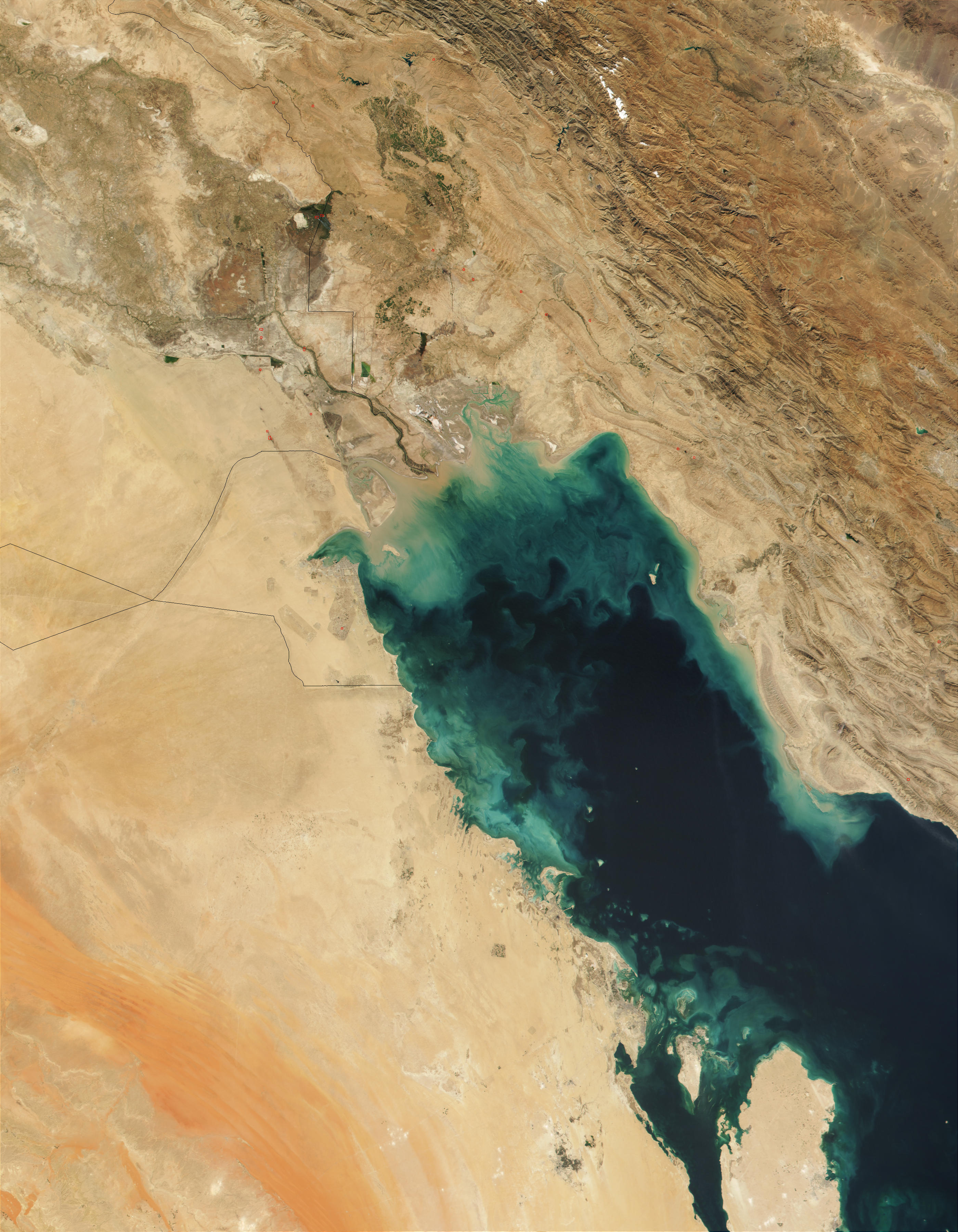 There is a large amount of sediment clearly visible in the true-colorimage of the Persian Gulf, acquired on November 1, 2001, by theModerate-resolution Imaging Spectroradiometer (MODIS). Carried by theconfluence of the Tigris and Euphrates Rivers (at center), thesediment-laden waters appear light brown where they enter the northernend of the Persian Gulf and then gradually dissipate into turquoiseswirls as they drift southward. The nutrients these sediments carry arehelping to support a phytoplankton bloom in the region, which adds somedarker green hues in the rich kaleidoscope of colors on the surface (seethe high resolution image).