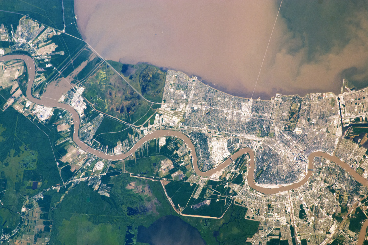 The Bonnet Carré Spillway delivered a plume of thick sediment to Louisiana’s Lake Pontchartrain in mid-May 2011. Taken on May 17, 2011, this astronaut photo shows a muddy plume in the lake, as well as the sediment-clogged Mississippi River meandering through the city of New Orleans. Water flowing through the spillway into Lake Pontchartrain is also muddy brown.