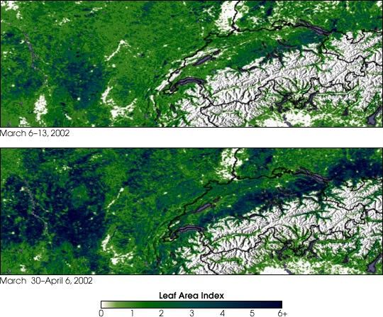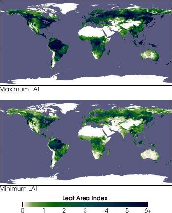 Remote sensing specialists at the University of Boston and NASA may now be onto a solution. Using a measurement known as Leaf Area Index, they have found a way to quantify plant growth on a global scale with satellite imagery. Their method can pinpoint when leaves begin to grow in a region, when they fall off, and how dense they become at peak growing season. With the aid of instruments such as MODIS aboard NASA’s Terra satellite and the AVHRR instrument aboard NOAA’s polar satellites, the researchers may soon be able to forecast the ways in which plants impact our weather and global climate.