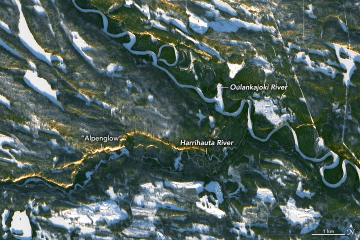 This winter scene comes from the Sápmi region of Finland (formerly known as Lapland), not far from Oulanka National Park. The natural-color image was acquired on January 30, 2014, by the Operational Land Imager (OLI) on Landsat 8. At the time, the Sun was just a few degrees above the southeastern horizon, leading to long shadows in the valleys and golden rays touching the peaks of mountains. Some of the landscape was likely lit by alpenglow, a phenomenon where airborne snow, water, and ice reflect sunlight down toward Earth even if the Sun is below the local horizon.