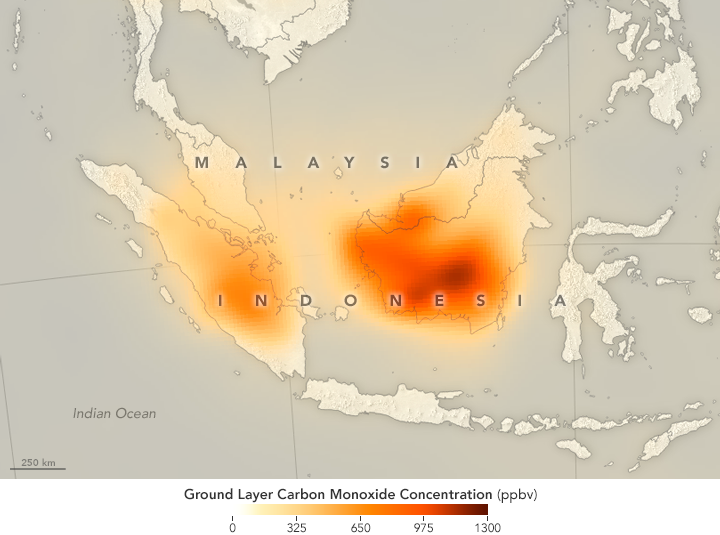 “The 2015 Indonesian fires produced some of the highest concentrations of carbon monoxide that we have ever seen with MOPITT,” said Helen Worden, a scientist at the National Center for Atmospheric Research. Average carbon monoxide concentrations over Indonesia are usually about 100 parts per billion. In some parts of Borneo in 2015, MOPITT measured carbon monoxide concentrations at the surface up to nearly 1,300 parts per billion.
