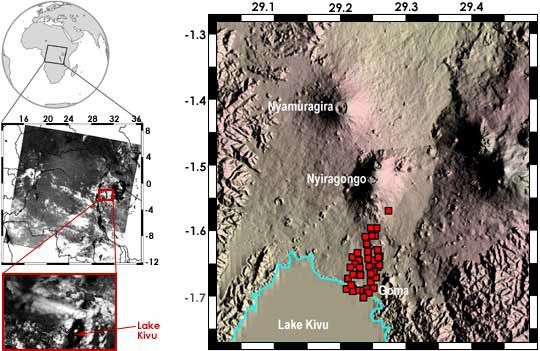 The image at right shows hot spots detected by the MODVOLC Thermal Alert System during Nyiragongo’s 2002 eruption. Each red square represents a single hot spot pixel detected by MODVOLC’s algorithm. (The size of each square is equivalent to the 1 km MODIS resolution.) The hot spots are overlaid on a shaded relief representation of Shuttle RADAR Topography Mapping mission (SRTM) digital elevation, for geographic context.