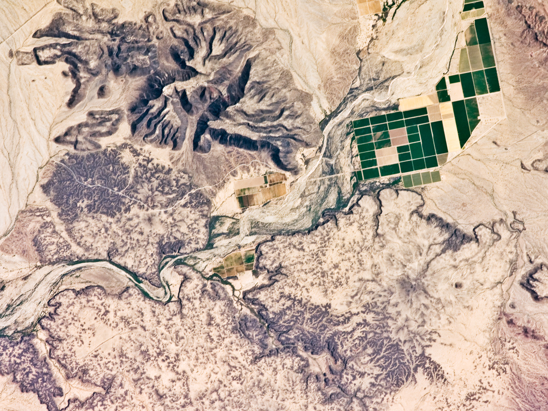This detailed astronaut photograph depicts a portion of the Gila River channel (image center) between the Sentinel Volcanic Field and Oatman Mountain in south-central Arizona. The northernmost boundary of the Sentinel Field is visible in the image, recognizable by the irregular flow fronts, or leading edge, of thin basalt lava flows which erupted from low volcanic cones approximately 3.3–1.3 million years ago. The lava flow tops range in color from dark brown exposed rock to a tan, carbonate-rich soil cover. Active agricultural fields along the Gila River are a rich green set against the surrounding desert.