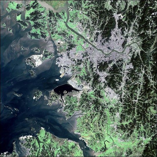 Water in this false-color image is dark blue and black for the most part. Light purple and brown patches in the water along the coastline show silt deposits. The darker purple and gray pixels on land are urban areas. The light green areas surrounding the city are farms and the dark green areas are forest. This image of Seoul was acquired on September 4, 2000, by the Enhanced Thematic Mapper plus (ETM+), flying aboard the Landsat 7 satellite.