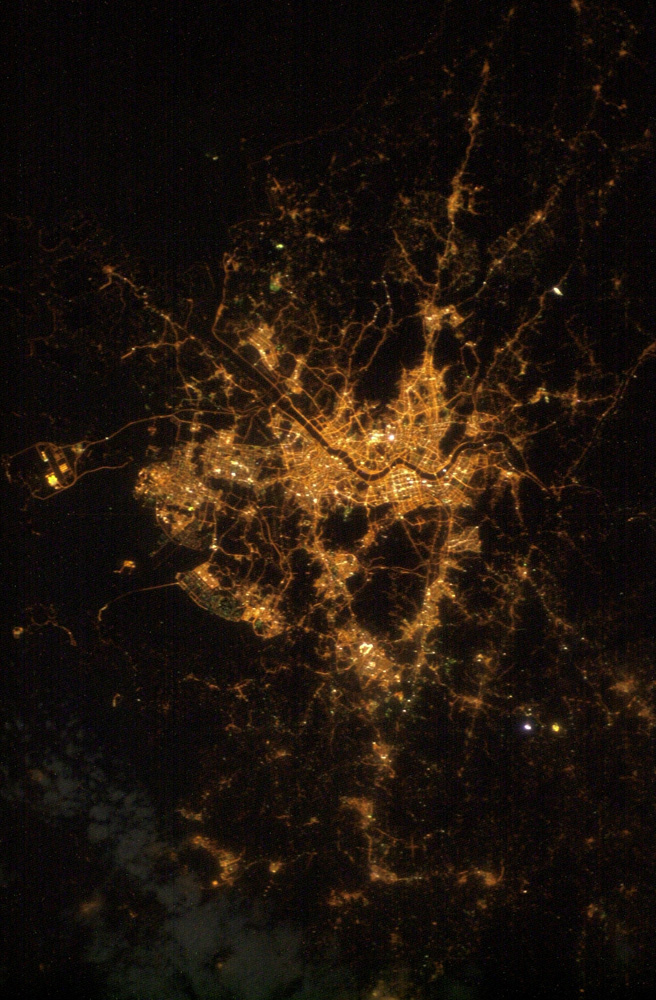 This astronaut photograph illustrates the Seoul urban area at night. Major roadways and river courses (such as the Han River) are clearly outlined by street lights, while the brightest lights indicate the downtown urban core (center of image) and large industrial complexes. One such complex is located at the far left of the image and occupies an island in the Yellow Sea. Very dark regions in the image are mountains or large bodies of water. Nighttime images have been used extensively in urban climate and urban growth research to map the extent of urban (bright) versus rural (dark) regions.