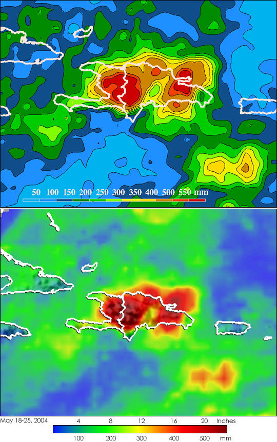 The Tropical Rainfall Measuring Mission satellite which was launched in November of 1997 uses both passive and active sensors to measure rainfall over the global tropics from space. The TRMM-based, near-real time Multi-satellite Precipitation Analysis (MPA) at the NASA Goddard Space Flight Center provides quantitative rainfall estimates over the global tropics. The above images show rainfall accumulation between May 18 and May 25, 2004. The first lower shows MPA rainfall totals over the northern Caribbean. The red areas indicate rainfall totals in excess of 14 inches over most of Hispaniola. Darker red areas along the border between Haiti and the Dominican Republic show rainfall totals for the period approaching 24 inches. The second image provides a close-in view of rainfall contours over the same period. It shows that the highest totals are right along the border between Haiti and the Dominican Republic and over the northeastern part of the Dominican Republic and exceed 550 mm (21.7 inches).