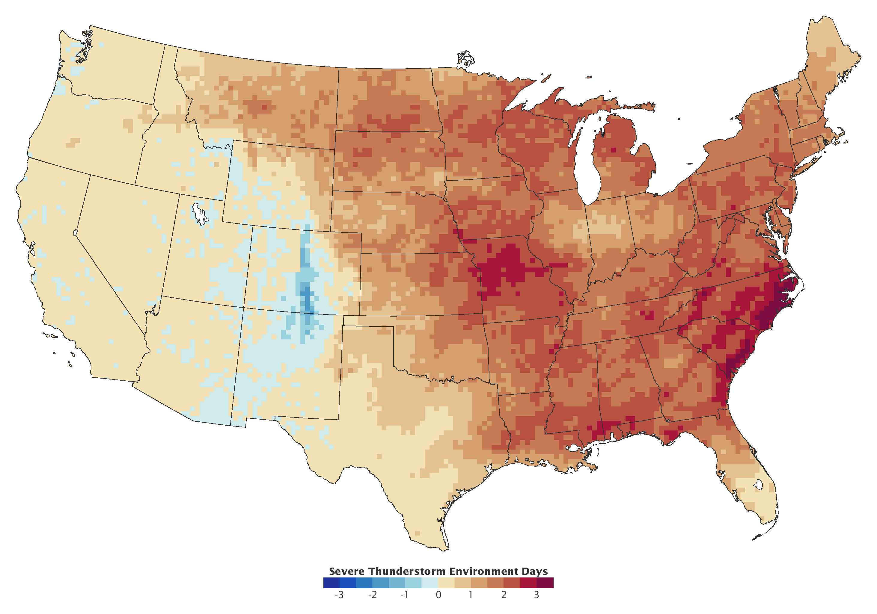 The maps above show the results of a model comparing the summer climate in 2072–2099 with the climate from 1962–1989. CAPE (top map) is predicted to rise enough to overwhelm a slight decrease in vertical wind shear (middle map), leading to an increase in severe thunderstorms (third map), especially in Missouri and coastal North and South Carolina. The modeling suggests that the increase in CAPE will be the strongest in the Southeast and the decrease in wind shear strongest in the Mountain West. The eastern United States will see more of an increase in days favorable to severe thunderstorm formation than the western part of the country.